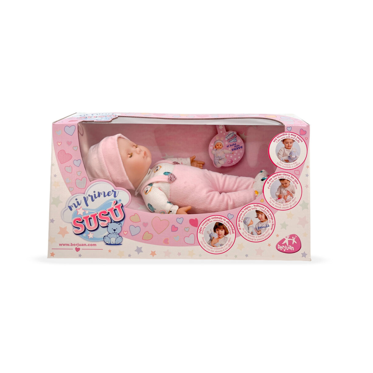 Moje první Susú měří 30 cm a je to nádherná, měkká panenka určená pro nejútlejší dětství. Když jí zmáčknete bříško, směje se, pláče a říká máma a táta. Když ji položíte, zavírá oči. Hrou s ní stimulujeme citovou vazbu u těch nejmenších. Susú je vyrobena z jemných, bezpečných materiálů a její roztomilý vzhled s velkýma očima si vaše dítko okamžitě zamiluje.