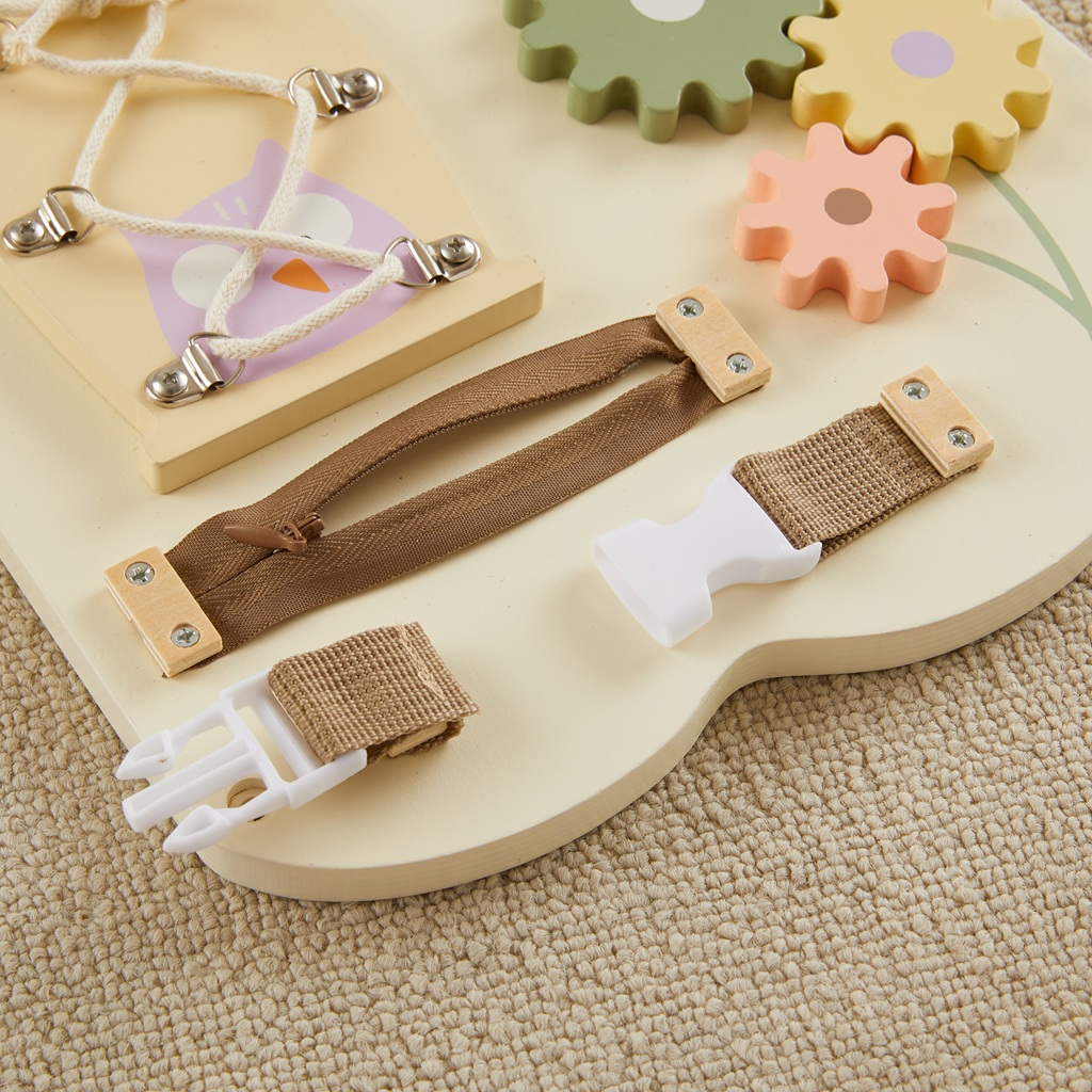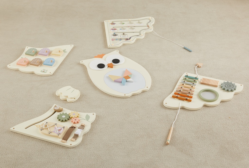 Táto veľká drevená motorická doska v tvare sovy v jemných pastelových farbách zaujme deti už na prvý pohľad. A to nielen svojim roztomilým vzhľadom, ale hlavne pestrou ponukou aktivít. Na roztiahnutých krídlach nájdu deti viac ako desať rôznorodých herných prvkov: xylofón, ozubené kolieska, zrkadlo, bludisko, posuvné a otváracie prvky, magnetickú tabuľku s magnetmi, dvierka s hmatovým prekvapením vo vnútri a rôzne farebné korálky. Všetky tieto detaily deti motivujú k skúmaniu, objavovaniu a hravému učeniu. Deti si pri hre precvičia jemnú motoriku, logické myslenie, zmyslové vnímanie aj koordináciu ruka-oko a to všetko zábavnou formou. Doska je dostatočne veľká pre skupinovú hru. Zároveň pôsobí ako štýlová dekorácia do detskej izby alebo herne. Hlavné vlastnosti: veľká motorická doska v tvare sovyjemné pastelové farby v kombinácii s prírodným drevomviac ako 10 rôznorodých aktivítrozvíja motoriku, logiku a zmyslové vnímaniekvalitné a bezpečné spracovanievhodná od 3 rokovedukatívna hračka aj štýlová dekorácia