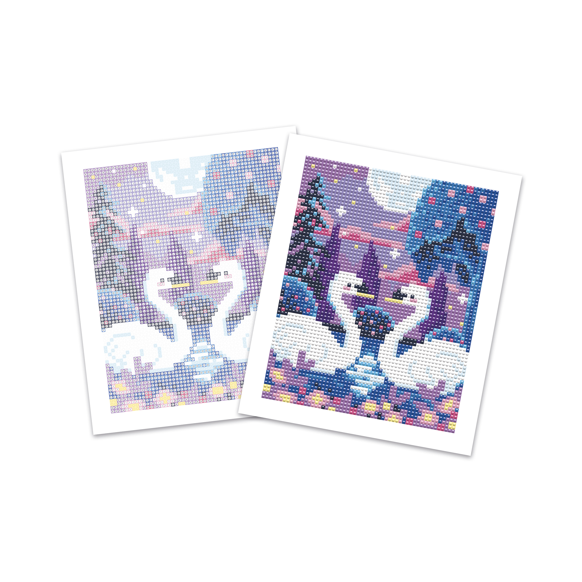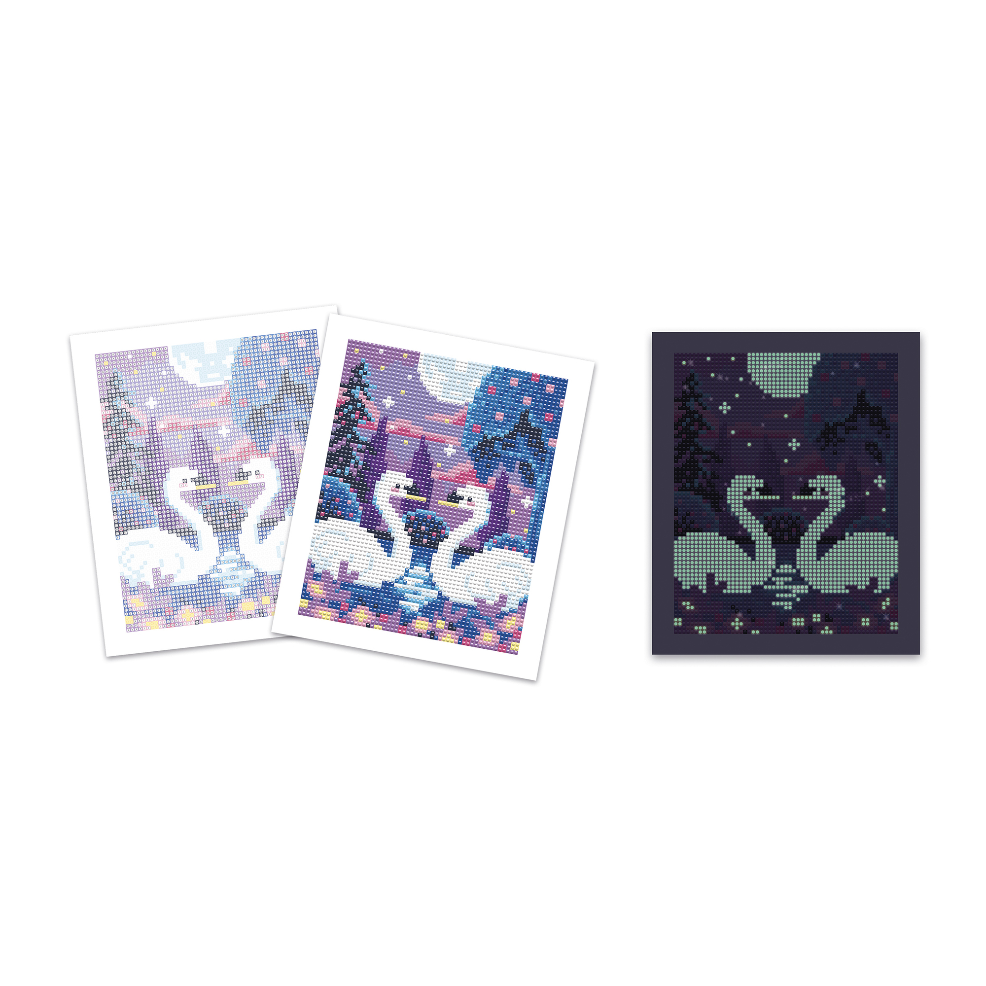 V mesačnom svite... Túto kreatívnu súpravu možno použiť na vytvorenie diamantového obrazu. Dizajn zobrazuje pár labutí v mesačnom svite. Súprava obsahuje 1 veľký samolepiaci obrázok (20,7 x 24,4 cm), 3900 mini kamienkov v 14 farbách (z ktorých 3 svietia v tme), 1 vŕtačku s 3 hrotmi rôznych veľkostí, 1 voskový štvorec, 1 drážkovaný podnos (na zarovnanie mini kamienkov v podnose) a 1 brožúrku s návodom a vzormi. Po dokončení obrázka sa dá krabica premeniť na krásny rámik na zavesenie vášho výtvoru. Vďaka fosforeskujúcim kamienkom budete môcť tieto labute obdivovať aj v tme! Táto aktivita pomáha rozvíjať trpezlivosť a pozornosť k detailom. Jej dokončenie trvá celkovo 3 hodiny (plus mínus) a je ideálna pre deti od 8 rokov.