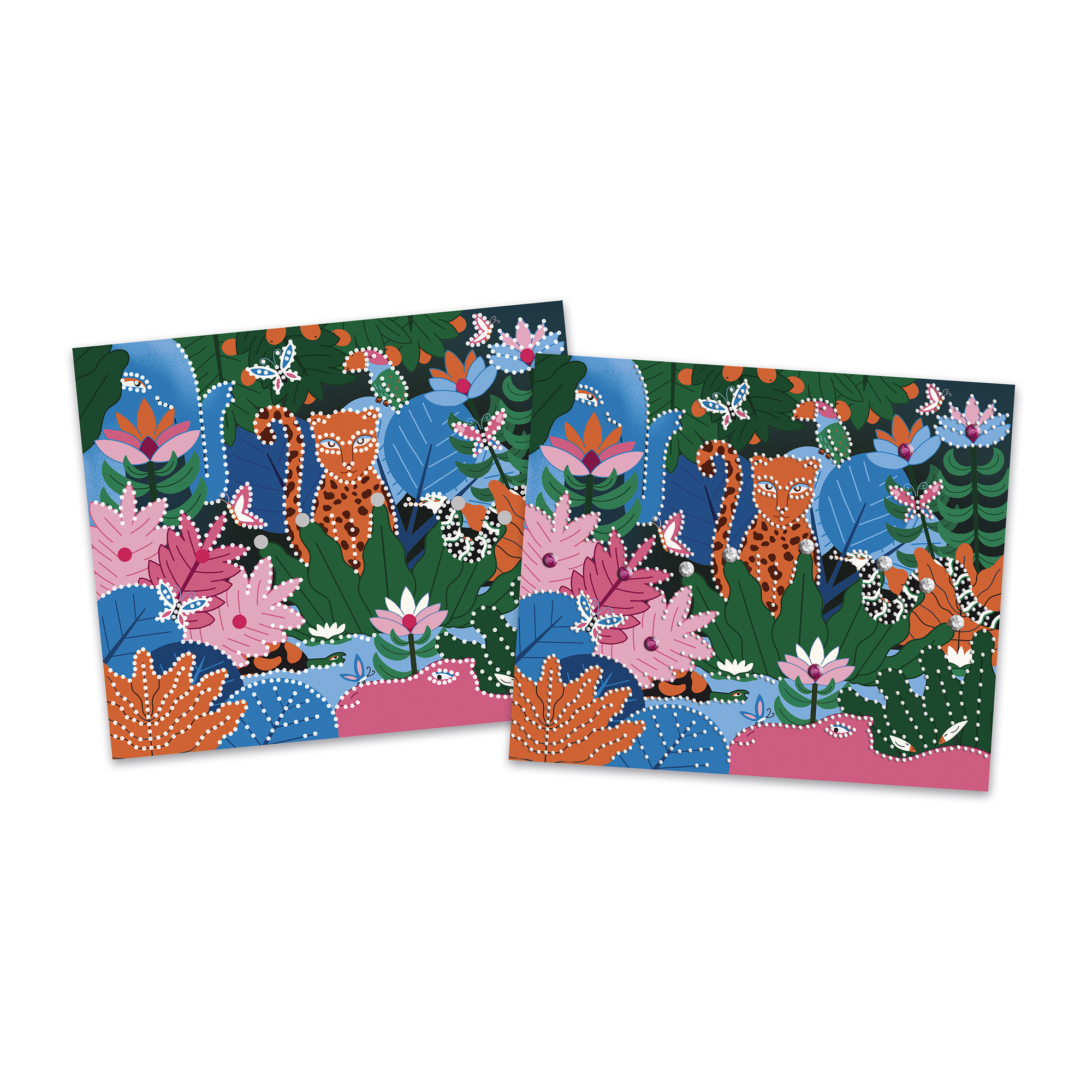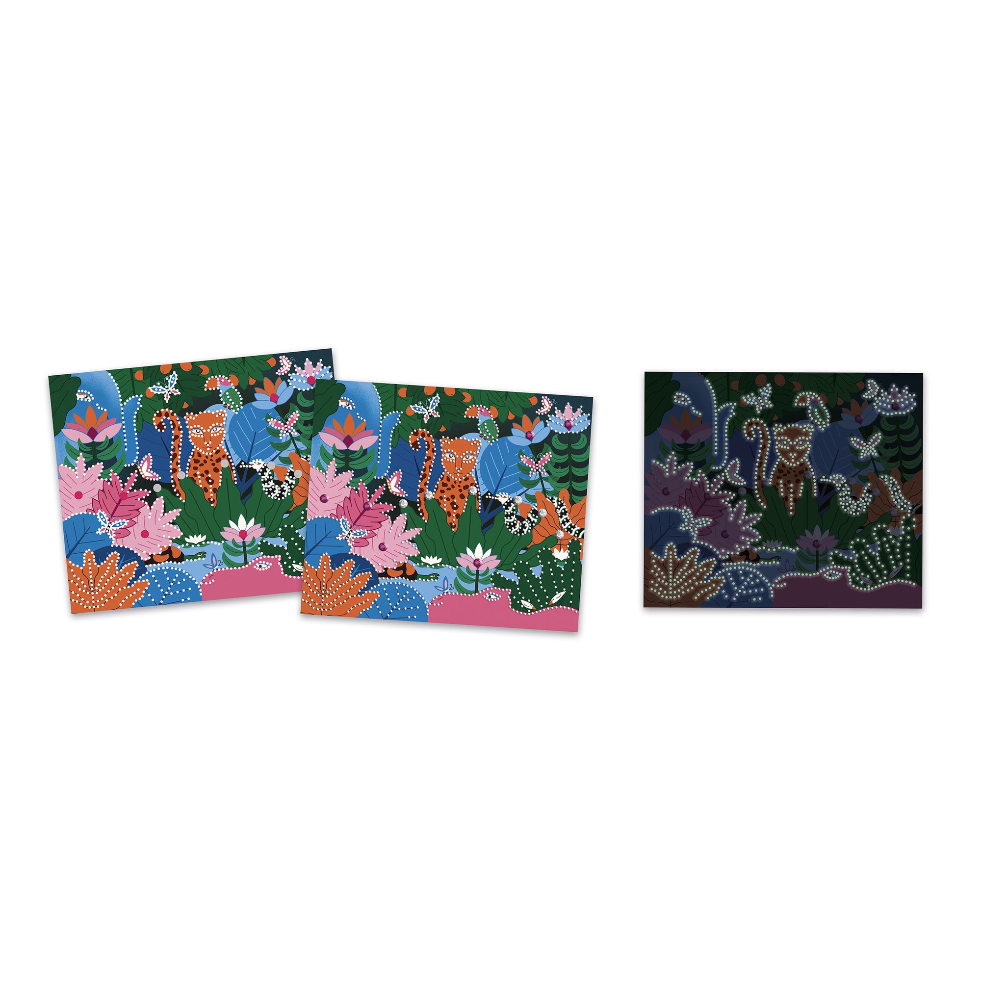 Dokážeš sa v noci vydať na cestu džungľou? Táto sada na tvorenie sa dá použiť na vytvorenie 1 obrázka pomocou nálepiek a techniky diamantovej maľby. Obsahuje 1 obrázok (21 x 25 cm), jeden hárok s 20 nálepkami s vopred určenými lepiacimi bodkami, 1200 mini kamienkov v 5 farbách, z ktorých 1 svieti v tme, 20 kamienkov (s rozmermi 8 mm a 2 farbami), 1 sadu náradia: 1 vŕtačku, 1 voskový uholník, 1 misku (ľahko sa zmestí do balenia súpravy) a 1 brožúrku s návodom a návrhmi.Táto aktivita, ktorá pomáha rozvíjať kreativitu a trpezlivosť, trvá približne 1 hodinu 40 minút. Je ideálna pre deti od 6 rokov.