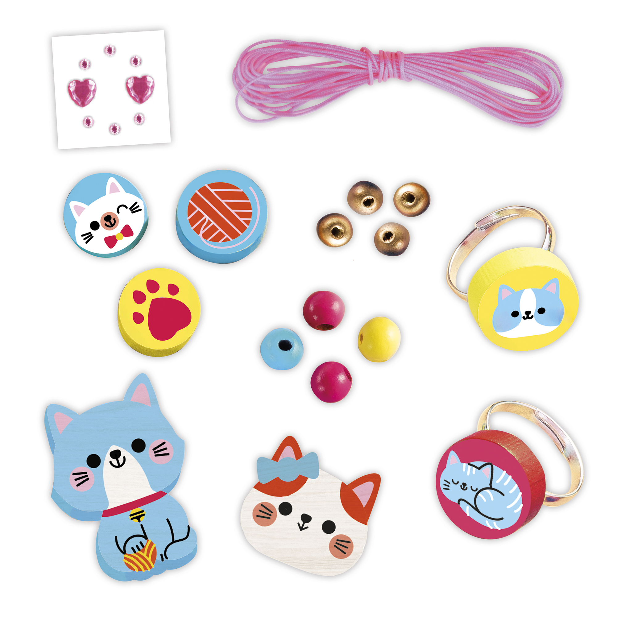 Mňauuuuu! Vytvorte si vlastnú sadu drevených šperkov! Z tejto sady si môžete vyrobiť 1 náhrdelník, 1 náramok a 2 prstene, pričom všetky majú mačiatka, a to vďaka pôsobivému obsahu: 2 tvarované a potlačené drevené korálky, 3 okrúhle potlačené drevené korálky, 33 farebných okrúhlych korálok, 22 zlatých korálok, 2 prstene s potlačenými plochými drevenými korálkami, 1 hárok s 8 kamienkami, 1 gumička a 1 leták s návodom a vzormi. Krabička sa zmení na roztomilú kabelku, v ktorej si môžete uložiť šperky a ďalšie malé tajomstvá. Táto aktivita, ktorá pomáha rozvíjať kreativitu a motorické zručnosti, trvá približne 17 minút. Je ideálna pre deti od 4 rokov.