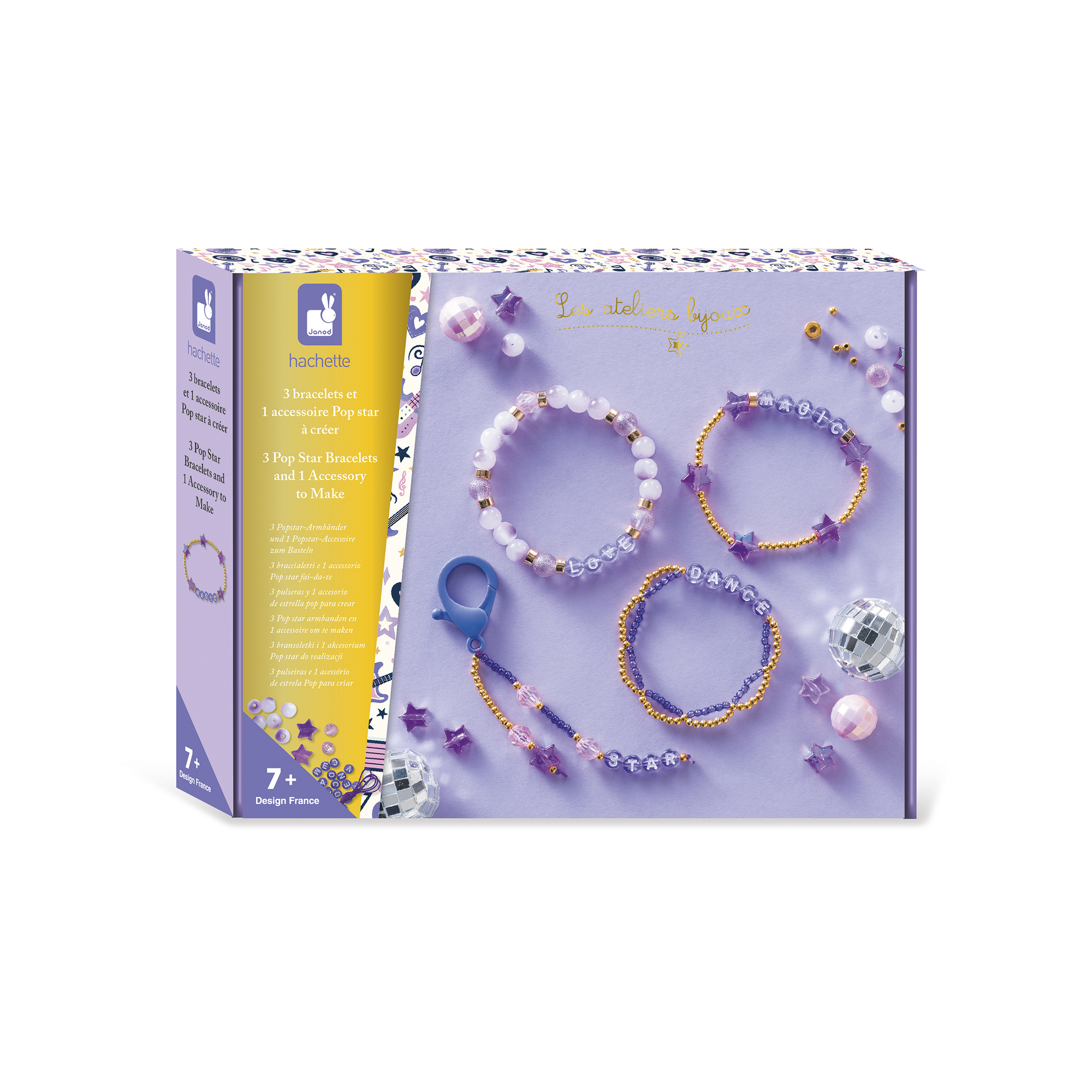 Staňte sa skutočnou popovou hviezdou! Vytvorte si 3 náramky a 1 kľúčenku, ktoré si môžete vymeniť s priateľmi, ak budete cítiť potrebu! Vďaka pôsobivému obsahu (18 fialových korálok s písmenami, 6 korálok s hviezdičkami, 12 zlatých kovových korálok, 120 okrúhlych zlatých kovových korálok, 60 modrých korálok, 4 korálky s ružovými fazetami, 4 priehľadné okrúhle korálky, 12 fialových korálok, elastická niť, fialová nefritová niť, 1 plastová spona na karabierku a 1 brožúrka s návodom a vzormi) bude táto sada ideálna pre tých, ktorí milujú šperky priateľstva. Táto aktivita, ktorá pomáha rozvíjať kreativitu a motorické zručnosti, trvá celkovo 50 minút (plus mínus). Je vhodná pre deti od 7 rokov.