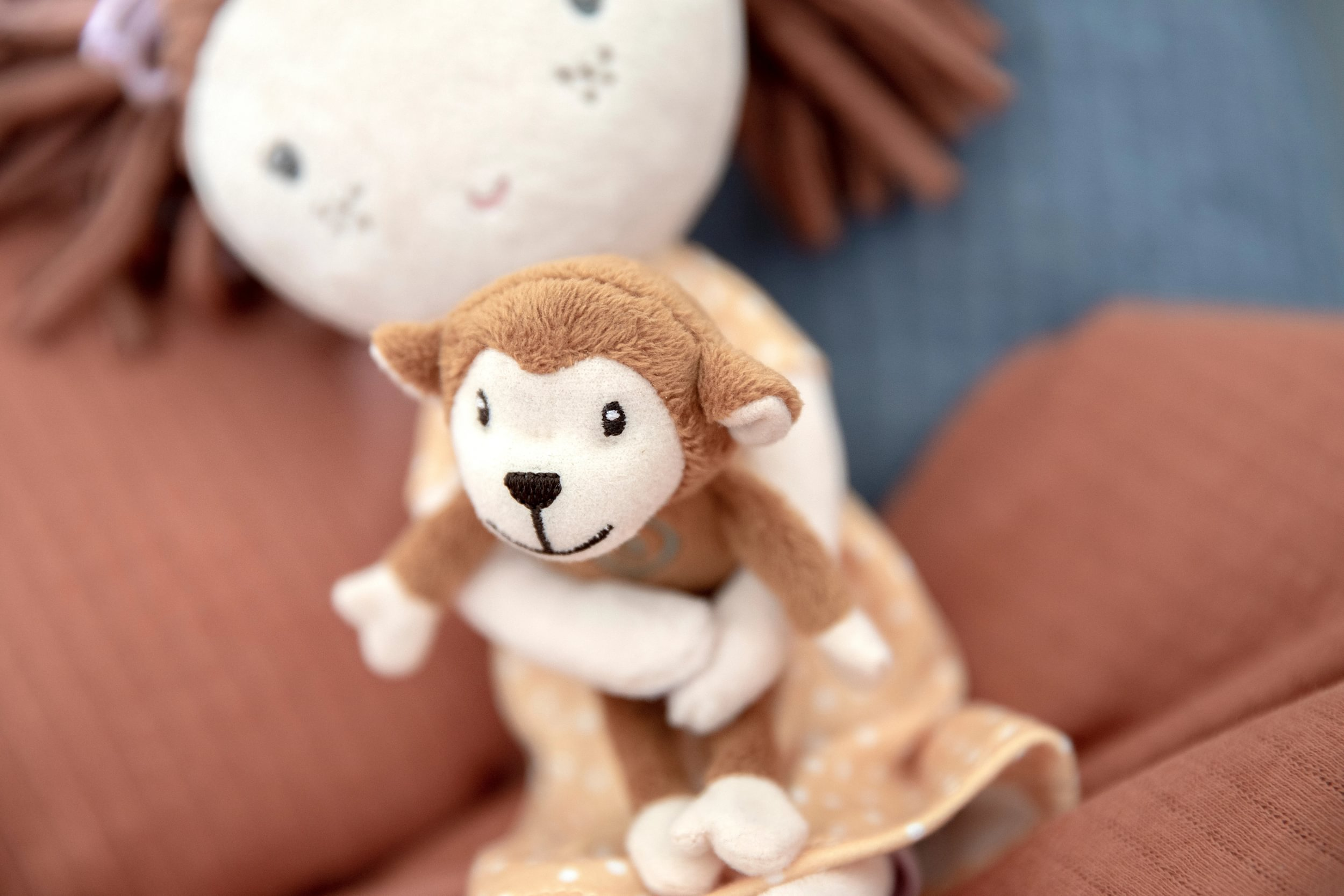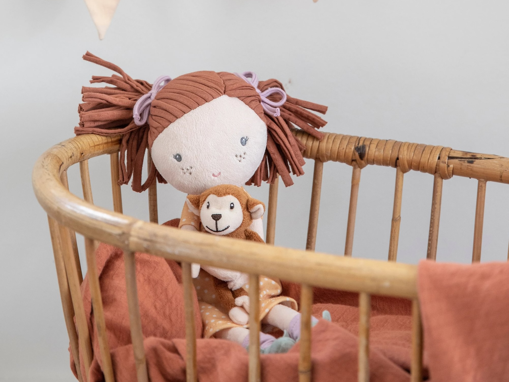 Něžná plyšová panenka Sophia z měkkého jemného materiálu je oblečená do krásných puntíkovaných šatiček. Panenka drží v ruce malou plyšovou opičku, připevněnou suchým zipem. Je vhodná na hraní i mazlení a bude se s ní i krásně usínat!