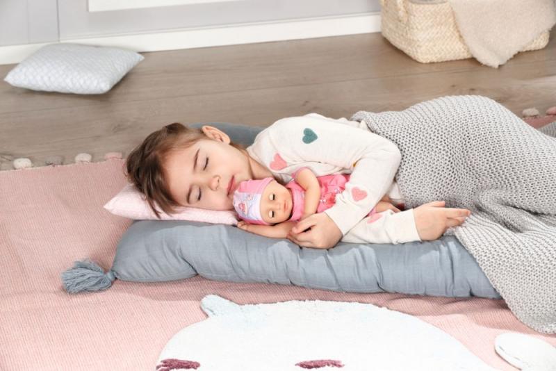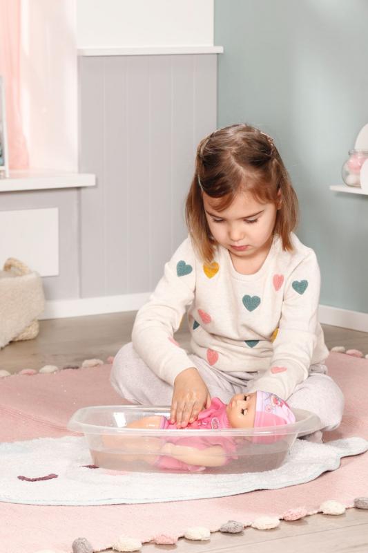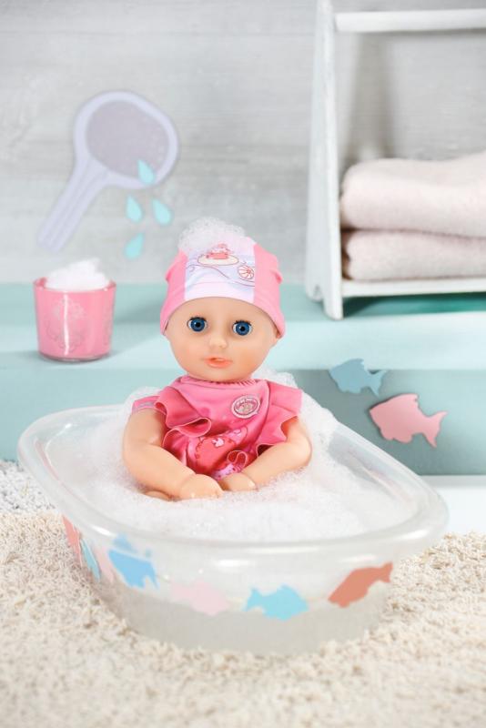 Čľapi čľap… Potápať sa vo vani, ako to na plavkách bábiky predvádza ovečka, je jedna z najobľúbenejších činností Kúpacej Annabell. Telíčko bábiky veľkosti 30 cm je ušité z látky a vyplnené guľôčkami. Ruky, nohy a hlavička sú vyrobené z mäkkého vinylu. Telíčko bábiky tvarujú ružové plavky a je ozdobené modrými švami a hravými volánikmi. Ružovo-bielu plávaciu čiapočku zdobí obrázok veselej kúpajúcej sa ovečky v plávacom kruhu a hrajúce sa s plážovou loptou. • Originálna bábika Baby Annabell. • Model „pre najmenších“ (30 cm) s vodeodolným telíčkom. • Pozvoľna prebúdza chuť k hre s bábikou a podporuje rozvoj empatie a zmyslu pre zodpovednosť u detí od jedného roka. Baby Annabell My First Kúpacia Annabell je bábika veľkosti 30 cm v plavkách a kúpacej čiapke.