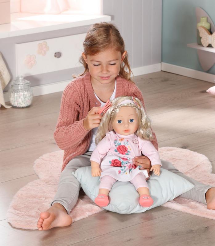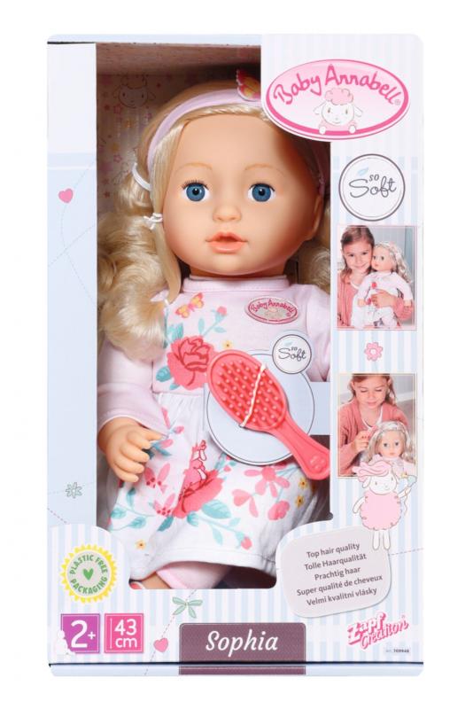 "„Sophie, nehýb sa, máš vo vlasoch motýľa!“ Aha, to je len motýľ na čelenke... Sophiine kvalitné blond vlásky možno upravovať do stále nových účesov a rozčesávať ružovou kefou. Malá milovníčka ruží má ale najradšej voľne rozpustené vlasy a ružovú čelenku s motýľou ozdobou. Jej obľúbené kvety má aj na topánočkách a šatách. Horný diel šiat má svetlo ružovú farbu a sukňa je biela. Legíny majú rovnakú farbu ako dlhé rukávy. Sophia sa rada venuje stylingu a obliekaniu, ale tiež sa rada hrá s deťmi od dvoch rokov. Módna látková bábika je vďaka mäkkému telíčku ideálna na maznanie. • Originálna bábika Baby Annabell s mäkkým telíčkom. • Na maznanie, hranie sa a branie všade so sebou. • Baby Annabell umožňuje realistickú a nápaditú hru s bábikou a podporuje rozvoj zodpovednosti a empatie. Baby Annabell Sophia je bábika veľkosti 43 cm. Oblečená je do šiat, legín a topánočiek. Súčasťou je čelenka a kefa na vlasy. "