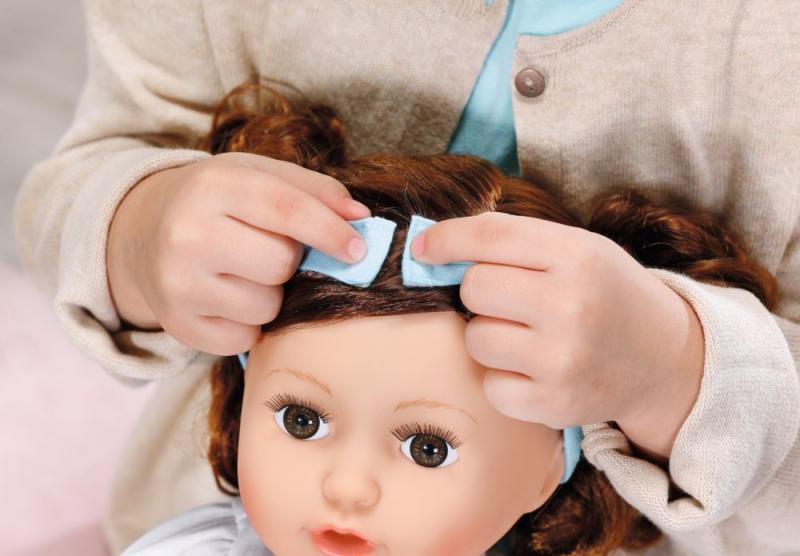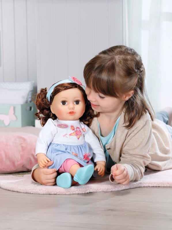 „Jé, jahodovo-vanilkový motýlik!“ Isabella miluje motýle a vždy im dáva mená, ktoré jej pripomínajú jej obľúbené druhy zmrzliny. Motýle na jej šatách a topánkach sú svetlo žlté ako vanilková zmrzlina a na okrajoch krídiel ružové ako jahodová zmrzlina. Takže naozaj jahodovo-vanilkové motýle. Horný diel šiat má bielu farbu a sukňa modrú. K tomu si Isabella obliekla ružové legíny. Kvalitné hnedé vlásky môžeš česať modrou kefou a upravovať do stále nových účesov. V tmavých vlasoch sa skvele vyníma modrá čelenka s ružou. Isabella sa rada venuje stylingu a obliekaniu, ale tiež sa rada hrá s deťmi od dvoch rokov. Módna látková bábika je vďaka mäkkému telíčku ideálna na maznanie. • Originálna bábika Baby Annabell s mäkkým telíčkom. • Na maznanie, hranie sa a branie všade so sebou. • Baby Annabell umožňuje realistickú a nápaditú hru s bábikou a podporuje rozvoj zodpovednosti a empatie. Baby Annabell Isabella je bábika veľkosti 43 cm. Oblečená je do šiat, legín a topánočiek. Súčasťou je čelenka a kefa na vlasy.