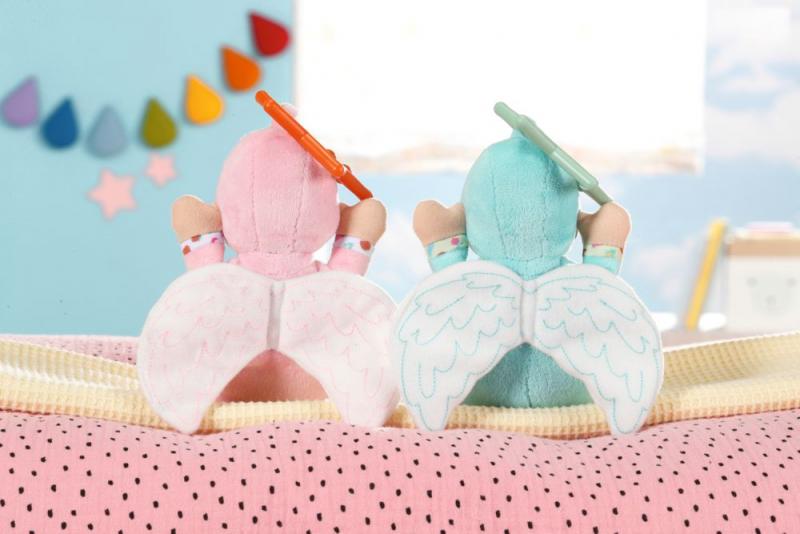 Maznanie je pre týchto dvoch malých anjelikov rajom na zemi. Najčastejšie sa bábiky veľkosti 18 cm pripínajú na hornú časť detskej autosedačky, do kočíka alebo postieľky, kde sledujú, čo sa deje v živote detí. Pomocou závesu v tvare hviezdičky je možné anjelikov pripevniť kamkoľvek. Pri jazde kočíkom po nerovných cestách, alebo keď sa kolíska hojdá sem a tam, sa ozýva nežný zvuk hrkálky, ktorá sa nachádza vo vnútri bábiky. Ak by bábiky zo svojho miesta na nebesiach spadli na zem, je možné ich obe vyprať v ruke na 30 °C. Vďaka mäkkému látkovému telíčku a mäkkej vinylovej hlavičke sa skvele hodia aj na maznanie a sú ideálnym spoločníkom pre najmenšie deti od narodenia. Malými detskými ručičkami môžu preskúmavať mäkkú látku a prišité krídelká aj objavovať zvuk hrkálky. Záves v tvare hviezdy môže slúžiť aj ako hryzátko. Pre akú farbu sa u týchto anjelikov rozhodnúť – ružovú alebo tyrkysovú? • Originálna bábika BABY born. • Na zavesenie na kočík, autosedačku, postieľku a pod. • Model „pre najmenších“ (18 cm) s veľmi mäkkým telíčkom. • Vhodná aj pre najmenšie deti už od narodenia. • S hrkálkou vo vnútri. • Možno ručne prať. BABY born for babies Anjelik je bábika veľkosti 18 cm s hrkálkou vo vnútri. Na výber v ružovej alebo tyrkysovej farbe.