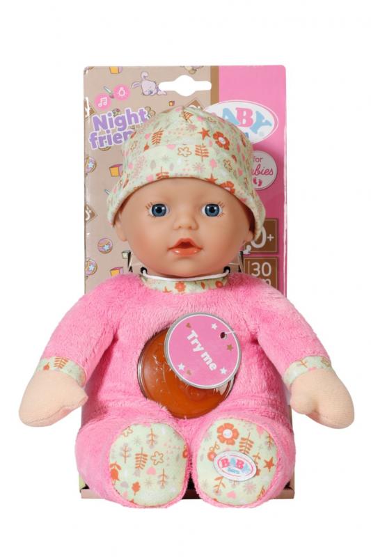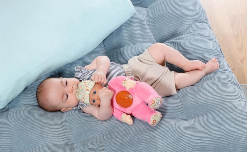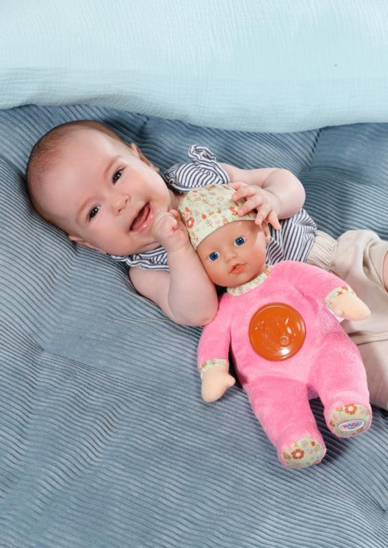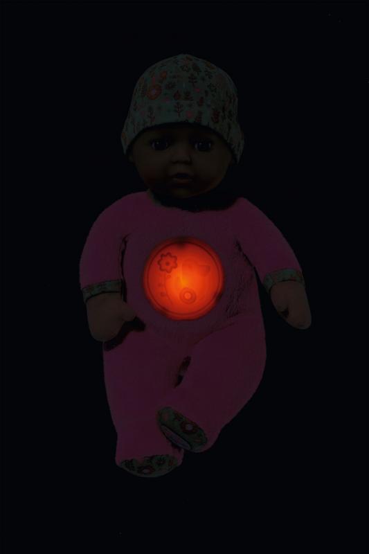 "Vďaka rozkošnej bábike „Svieti v tme“ sa zo zaspávania stane detská hra. Látkovú bábiku veľkosti 30 cm môžete umiestniť do kolísky alebo do detskej postieľky tých najmenších detičiek už od narodenia. Má mäkké telíčko a rozkošné plyšové dupačky. Stlačením kolieska na brušku sa aktivuje nočné svetielko a rozoznejú sa upokojujúce melódie. Mäkkú vinylovú hlavičku bábiky chráni čiapočka s roztomilou potlačou. Rôzne textúry materiálov na bábike povzbudzujú malé deti k hraniu a objavovaniu. A keď sa deti rozhodnú ručičku alebo nožičku bábiky použiť ako hryzací krúžok, bábika sa dá jednoducho vyprať v ruke, stačí z nej len vybrať zvukový modul. • Originálna bábika BABY born. • Deti sa s bábikou môžu hrať a túliť sa k nej, bude im pomáhať v pokoji zaspať, zároveň je to skvelá bábika na predstavenie hry na mamičku a dieťatko. • Telíčko bábiky a končatiny sú ušité z látky s mäkkou výplňou vo vnútri. • Vhodná aj pre tie najmenšie bábätká už od narodenia. • Funguje na batérie (batérie sú súčasťou balenia). • Bábiku možno vyprať v ruke, stačí vybrať zvukový modul. BABY born for babies Svieti v tme veľkosti 30 cm so zvukmi a svetelnými efektmi (nočné svetlo a zvuk uspávanky)."