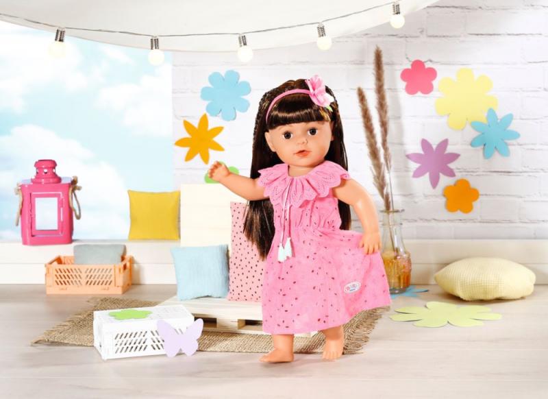 Štýlové kvetinové deti si tento outfit zamilujú. Šaty z ružovej krajkovej látky majú starostlivo prepracovaný naberaný golier. Visia z neho ružové šnúrky s hravými strapcami na konci. Nevyhnutným doplnkom k romantickým šatôčkam je čelenka do vlasov s veľkým ružovým kvetom. • Kvalitné oblečenie pre originálnu bábiku BABY born. • Pre radosť z nápaditej, rozmanitej a dlhotrvajúcej hry. BABY born Kvetinové šatôčky pre bábiky veľkosti 43 cm. Súčasťou sú šatôčky a čelenka a vešiačik.
