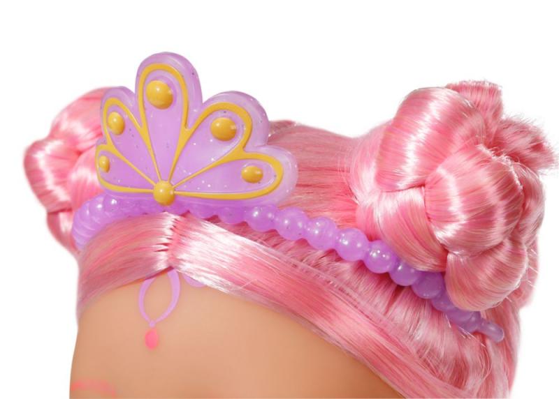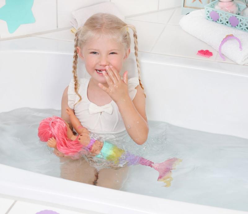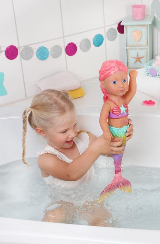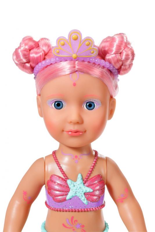 Keď pomyslíte na more, predstavíte si modrú farbu. Áno, voda je modrá, ale pod vlnami sa schováva nádherný svet plný farieb. BABY born Little Morská princezná je skvelým príkladom pestrofarebných tvorov žijúcich pod vodnou hladinou. Jej plutva je nádherne farebná a trblietavá. Pri kontakte s vodou sa dokonca hýbe. Horný diel plaviek v mušličkovom dizajne a farebné obrázky na tele víly farebne ladia s chvostovou plutvičkou. Dlhé ružové vlásky má morská princezná ozdobené fialovou čelenkou. Vlásky je možné hrebeňom upraviť vždy do nového účesu. • BABY born Little Morská princezná. • Vo vode sa hýbe. • Rôzne hry s bábikou BABY born povzbudzujú predstavivosť a bolo preukázané, že podporujú rozvoj spoločenských zručností a hodnôt, ako je zodpovednosť, komunikácia a empatia. • Funguje na batérie (nie sú súčasťou). BABY born Little Morská princezná meria 46 cm. Súčasťou balenia je hrebienok a čelenka.