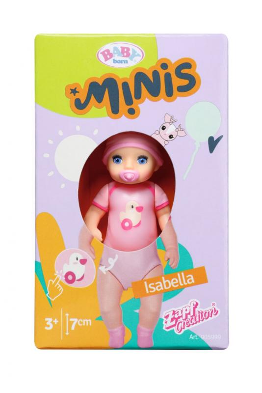 "Bábiky BABY born Minis sa vďaka svojej praktickej veľkosti 7 cm zmestia do každého batôžku alebo kabelky a deti si ich môžu vziať všade so sebou. Každá z figúrok je jedinečná. Roztomilé bábätká majú malých zvieracích kamarátov a niektoré aj efekt zmeny farby. Pohyblivé ruky, nohy a hlava zaručujú, že sa hranie s bábikami premení na nezabudnuteľný zážitok a zbieranie bábik tak bude ešte zábavnejšie! • Bábiky BABY born Minis na hranie aj zbieranie. • Súčasťou je malý zberateľský plagátik a aršík so samolepkami BABY born Minis."
