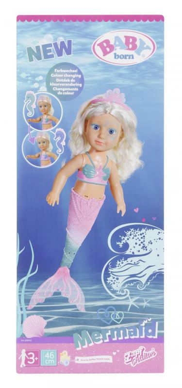 Morské víly sú tajomné bytosti a BABY born Morská víla nie je výnimkou. Vo vode vlní farebnú plutvu a elegantne pláva. Akonáhle sa dostane do kontaktu so studenou vodou, zmení sa farba oblečku: ružová na tyrkysovú a tyrkysová na modrú. Ako to len robí? V dlhých blonďatých vláskoch má farebné pramienky. Vlásky má ozdobené čelenkou. Súčasťou balenia je aj ružový hrebeň, ktorý pomáha pri tvorení krásnych účesov. • BABY born Morská víla. • Vo vode hýbe plutvou. • S efektom zmeny farby. • Rozmanitá "hra na" s bábikou BABY born povzbudzuje predstavivosť a bolo preukázané, že podporuje vývoj sociálnych zručností a hodnôt ako je zodpovednosť, komunikácia a empatia. • Funguje na batérie. BABY born Morská víla, 46 cm. Súčasťou je hrebeň a čelenka.
