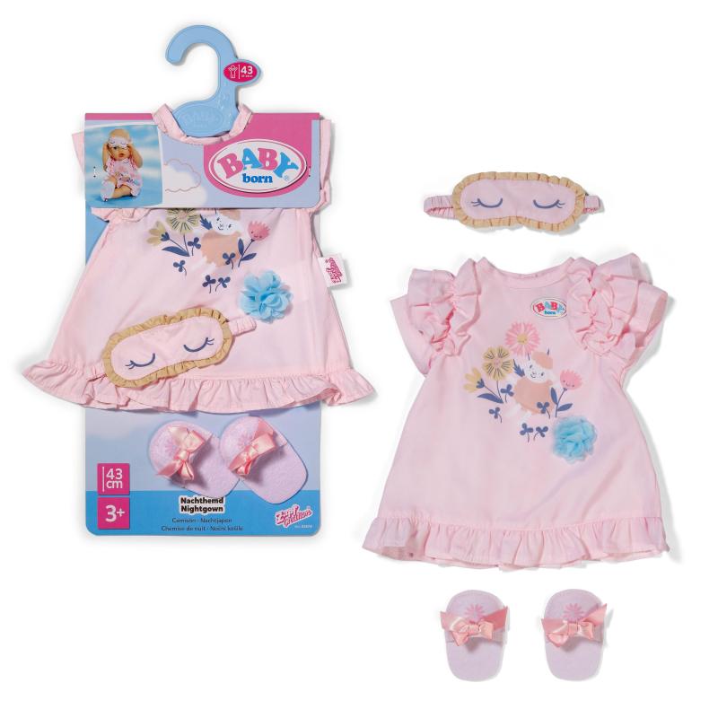 "S touto roztomilou sadou nočnej košieľky je bábika pripravená na krásny spánok. Mäkká nočná košieľka s volánikovými detailmi na leme a rukávoch. Pohodlné papučky a maska ??na spanie dokonale dopĺňajú outfit. Nevyhnutná sada pre sladké sny. • Nočná košieľka, maska ??na spanie a papučky • Hravý dizajn s roztomilými motívmi • Ideálne pre realistické uspávanie bábik • Vhodné pre bábiky veľkosti 43 cm a medvedíka BABY born • Jemné pastelové farby a elegantný dizajn • Ideálny roztomilý outfit pre bábiky"