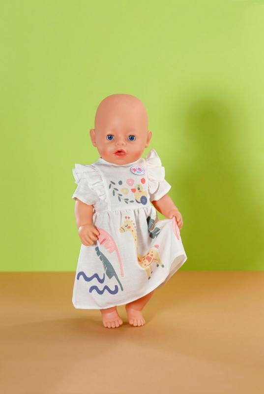 "Svetlé šaty s volánikovými rukávmi, obrázkom žirafy a motívmi džungle pre bábiky veľkosti 43 cm. • Letná nálada: Šaty s motívom žirafy a džungle. • Udržateľnosť: Súčasťou je ramienko z recyklovaného materiálu. • Vhodné pre bábiky veľkosti 43 cm a pre medvedíkov BABY born Teddy. • Kvalitný doplnok pre radosť z nápaditej, rozmanitej a dlhotrvajúcej hry."