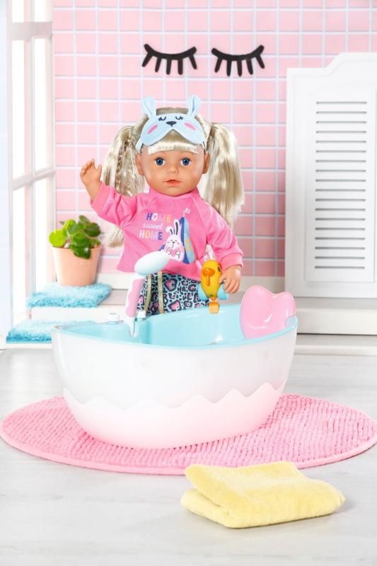 Zamieriť, vystreliť… zásah! Starší braček je teraz pekne mokrý. S takou kačičkou sa dá vo vode skvele bojovať. Môžeš ju umiestniť na rôzne miesta po okraji vane. Rovnako tak aj ružový vankúšik. Vaňa je zvnútra modrá ako voda a zvonku biela s vyznačenou vlnkou. Keď stlačíš tlačidlo vedľa sprchy, vonkajší plášť vane sa rozsvieti v rôznych farbách. Sprchové tlačidlo aktivuje bielo-ružovú sprchovú hlavicu. Pokiaľ je vaňa prázdna, budete počuť špliechanie a typické zvuky vody. Pokiaľ bola vaňa vopred naplnená vodou, tečie zo sprchovej hlavice voda. Sprchovú hlavicu je možné nakloniť smerom do vane, aby sa nestratila ani kvapka vody. Hadicu je možné vytiahnuť, aby sa bábika BABY born mohla dôkladne osprchovať. • Kvalitné príslušenstvo pre originálnu bábiku BABY born. • Pre radosť z nápaditej, rozmanitej a dlhotrvajúcej hry. • Vhodné pre bábiku veľkosti 36 cm a 43 cm. • Funguje na batérie (nie sú súčasťou). BABY born Vaňa so svetelnými a zvukovými efektmi. Súčasťou je vankúšik a striekacia kačička.