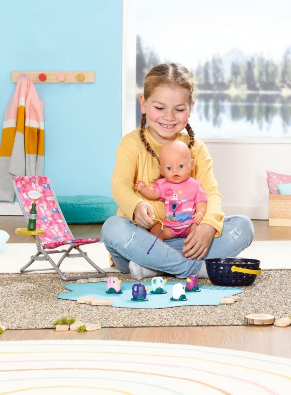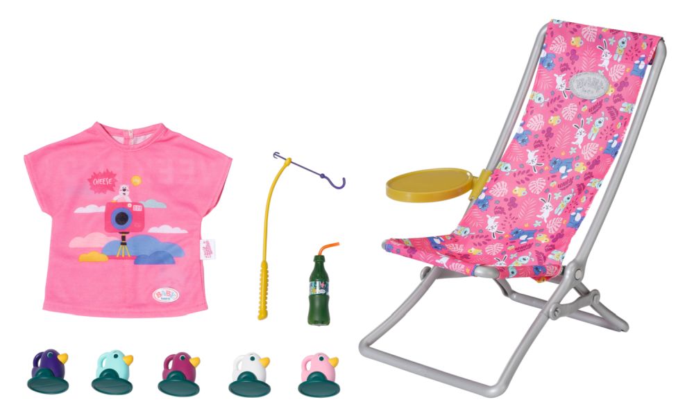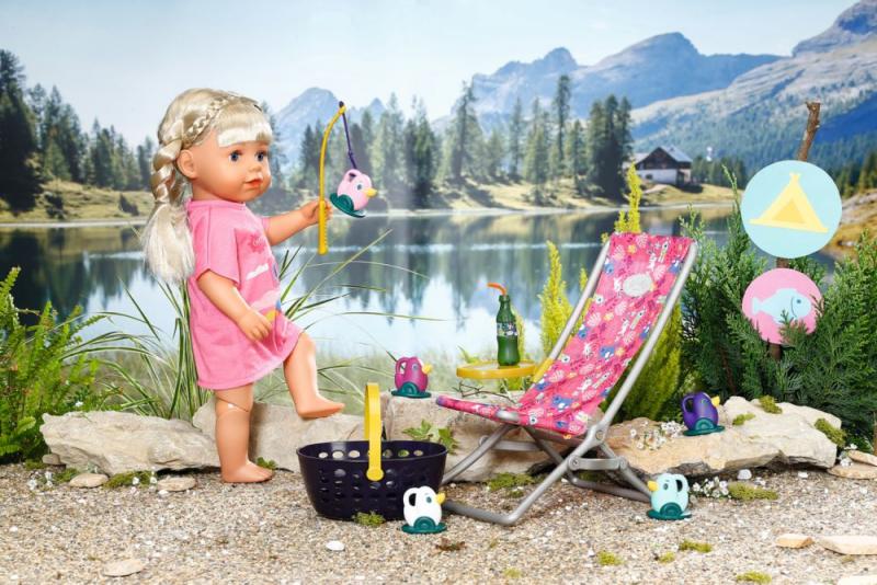 „V mori je rýb oveľa viac…“ Ale BABY born radšej chytá roztomilé káčatka. Zatiaľ čo pohodlne sedí v ružovom lehátku s farebným vzorom, snaží sa na háčik udičky chytiť jednu z piatich kačičiek. Tu a tam si usrkne limonádu, ktorú má položenú na žltom stolíku pri ležadle. Keď vyloví všetky kačičky a má ich uložené v modrom koši, vráti ich späť do rybníka a zábavná hra môže začať znova. Na túto hru na rybárčenie si BABY born obliekla ležérne dlhé ružové tričko s roztomilou potlačou. • Kvalitné príslušenstvo pre originálnu bábiku BABY born. • Pre radosť z nápaditej, rozmanitej a dlhotrvajúcej hry. • Vhodné pre bábiku veľkosti 36 cm a 43 cm. BABY born Víkendová súprava na rybárčenie obsahuje oblečenie, lehátko so stolíkom, fľašu s limonádou, košík, 5 kačičiek a rybársky prút.