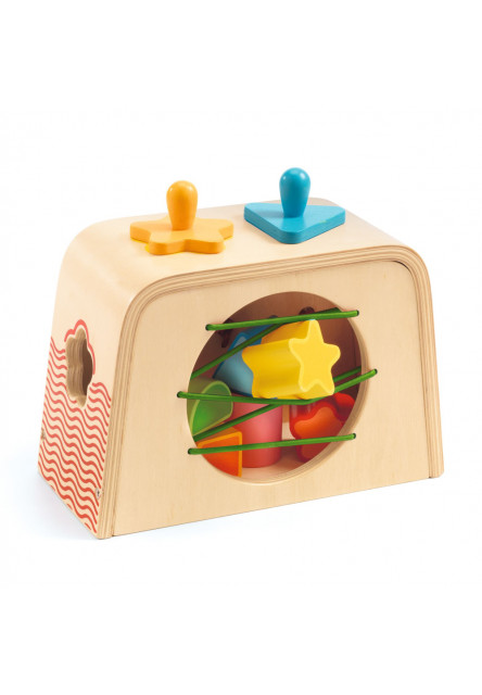 Drevená motorická hračka z farebnej kolekcie Baby color. Batoľa objaví 3 spôsoby vkladania geometrických dielov do skrinky. Diely vkladá do tvarovaných otvorov s príklopkou, s vrchnákom a do voľného otvoru. Na zadnej strane skrinky je otvor s gumičkovým výpletom, cez ktorý sa dajú diely vybrať.