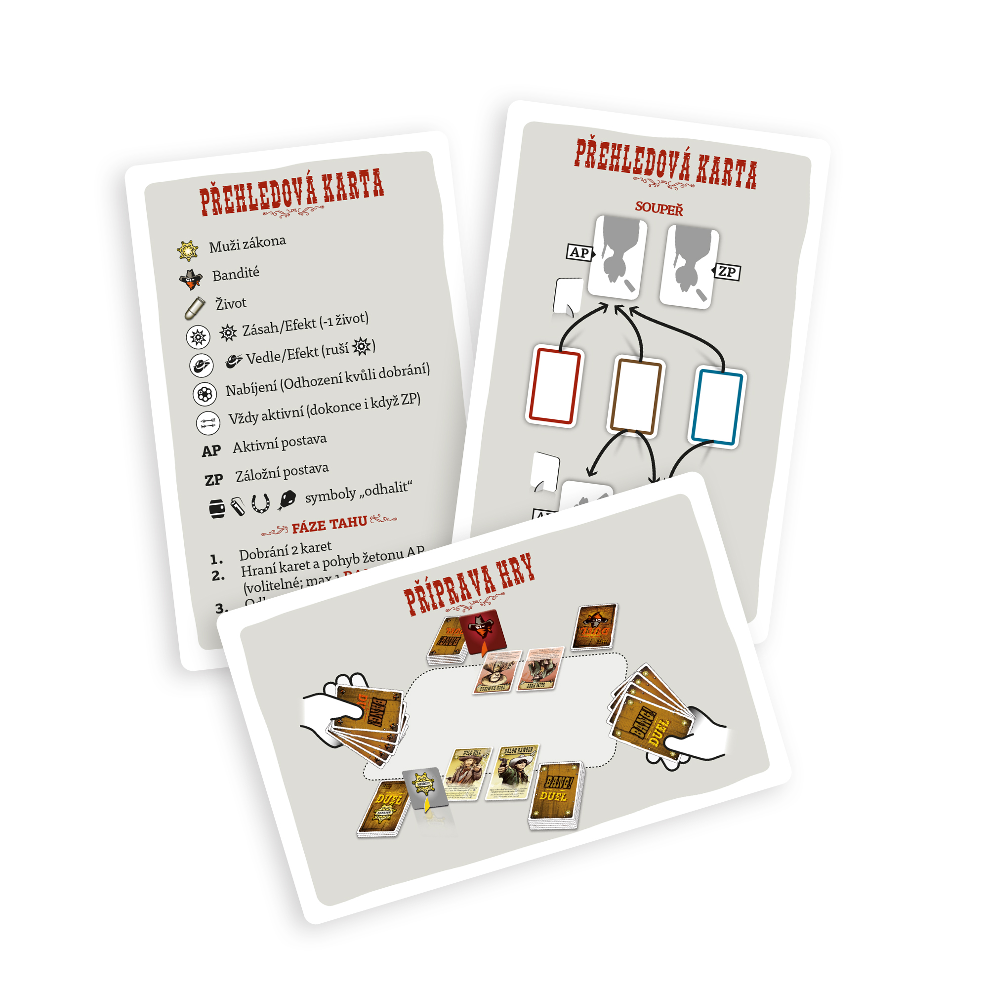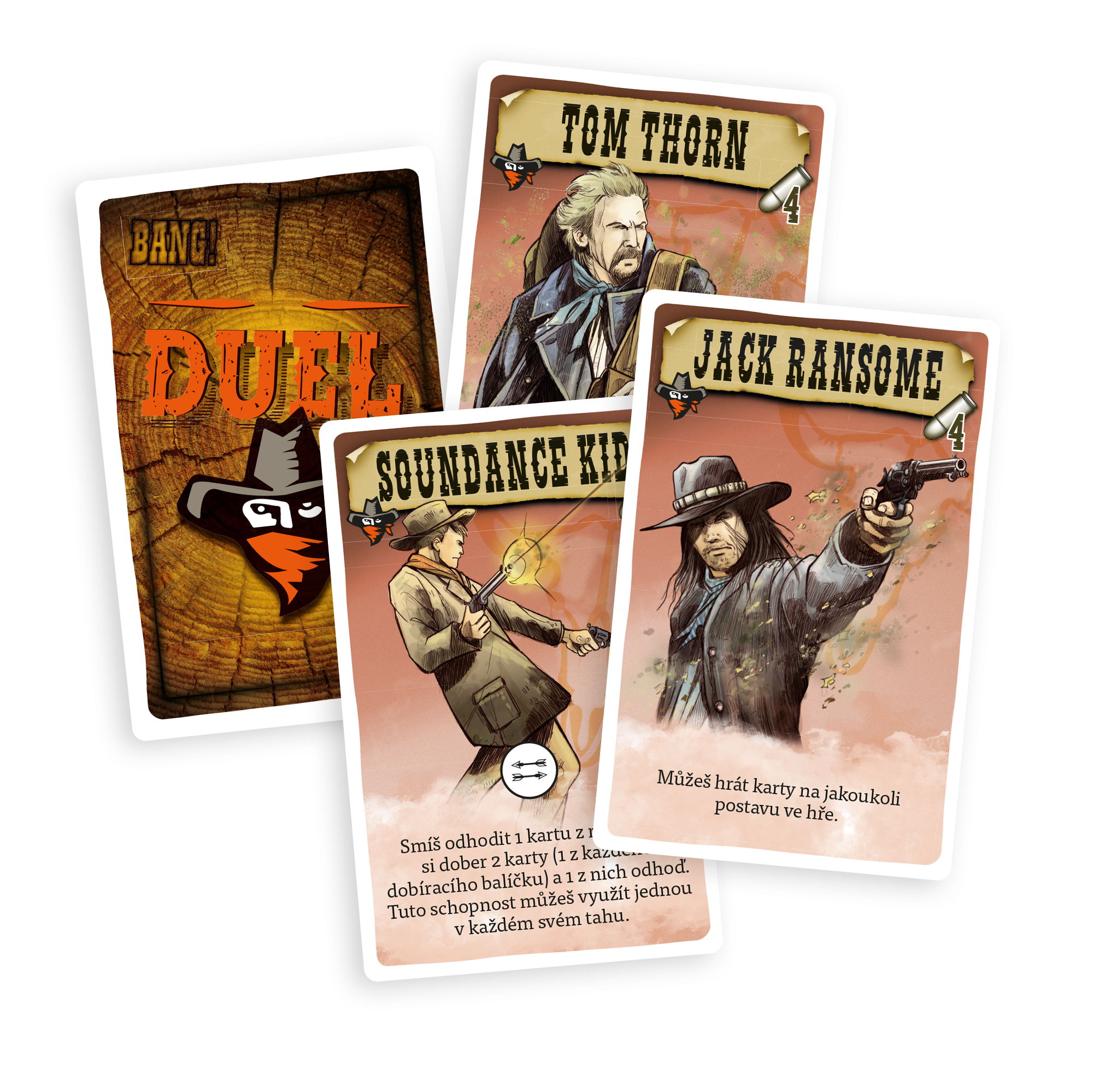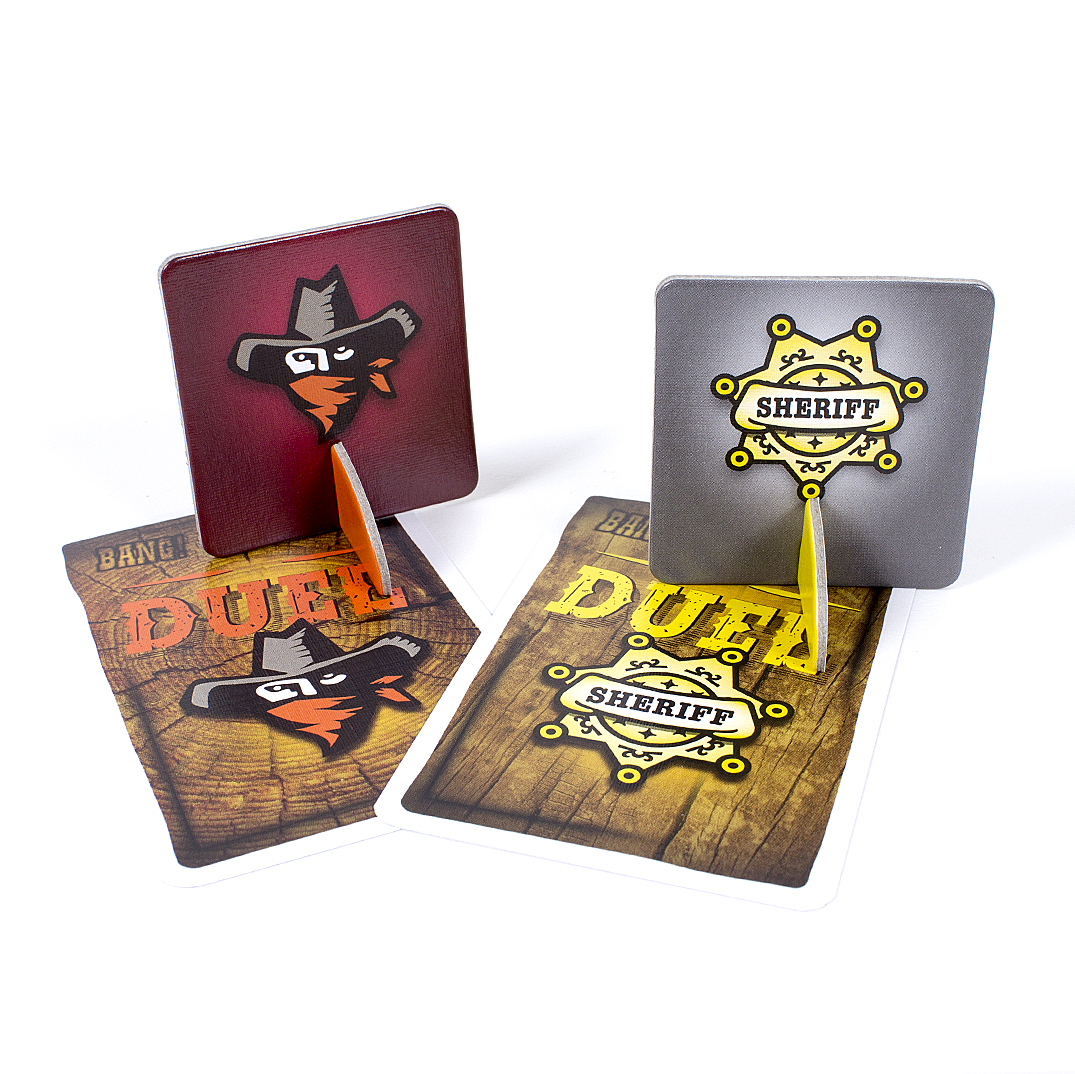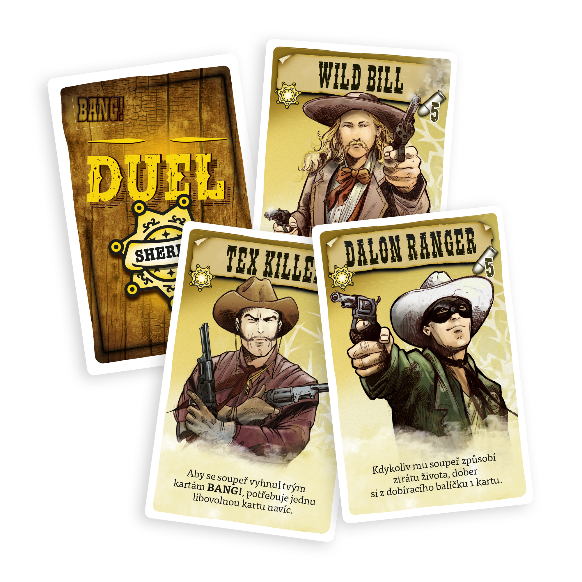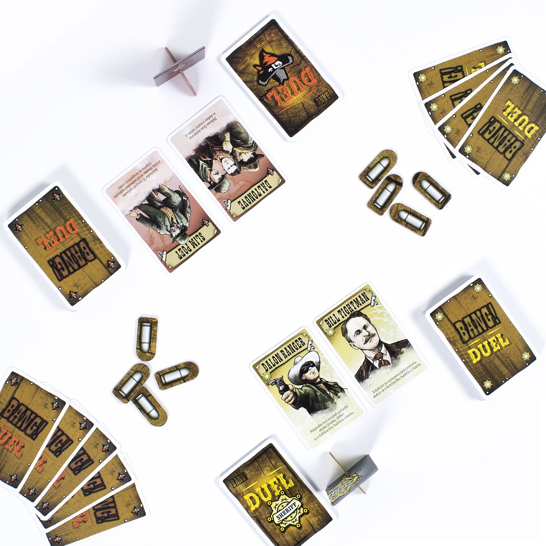 Obľúbená kartová hra BANG! z prostredia Divokého západu prichádza v prevedení pre dvoch hráčov. Konečne nadišiel čas, kedy sa zákon stretne tvárou v tvár so zločinom. Neľútostný boj do posledného muža si žiada nepriestrelnú stratégiu a chladnokrvnú taktiku. Rozostavte svojich pištoľníkov na miesta a udeľujte im príkazy, ktoré Vás dovedú k víťazstvu. Bang! Duel je samostatná hra pre dvoch hráčov, ku ktorej nepotrebujete základnú hru Bang! Hráči si rozdelia strany, za ktoré budú hrať - muži zákona proti banditom. Zvíťazia ostrieľaní strážci zákona alebo sa ako poslední budú smiať neľútostní banditi? Princíp hry: Hru hrajú dvaja hráči. Každý hráč ovláda svoju skupinu pištoľníkov. Každá skupina má dva typy postáv - aktívne postavy a postavy v zálohe. Každý hráč má svoj balíček kariet. Tieto balíčky sa ale v priebehu hry zmiešajú dokopy. V hre víťazí ten, kto ako prvý vyradí postavy svojho protivníka. Zvyčajne sa hrá so štyrmi postavami. Hra obsahuje niekoľko typov kariet. Karty akcie majú hnedý okraj a ich efekt sa vyhodnotí okamžite. Karty vybavenia majú modrý okraj a ich použitie má dlhodobý efekt. Bang! karty majú červený okraj - nimi útočíte na súperovu aktívnu postavu, za každý ťah môžete túto kartu zahrať iba jednu. Obsah: - 80 hracích kariet, - 24 kariet postáv, - 4 prehľadové kraty, - 1 karta prípravy, - 20 žetónov nábojov, - 2 žetóny aktívnych postáv, - pravidlá v slovenskom a českom jazyku.