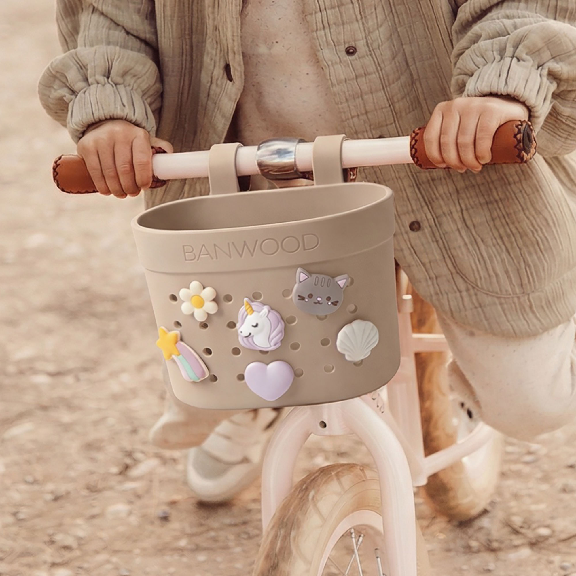 Košík, ktorý si môžete prispôsobiť. Víziou Banwood je pozitívne ovplyvňovať aktívny životný štýl detí od útleho veku. Banwood ponúka štýlové produkty v nadčasovom minimalistickom dizajne a vysokej kvalite, ktoré pomáhajú rozvíjať osobnosť detí a vytvárať spomienky na detstvo plné radosti. Milujeme spôsob, akým sa deti hrajú! Nadčasový škandinávsky dizajn v klasickom “vintage” štýle, bez kompromisov na kvalite a bezpečnosti. Banwood košík Pin & Ride je vyrobený z recyklovanej gumy v niekoľkých jednofarebných zemitých tónoch. Je ideálny na prenášanie obľúbených vecí, od malých hračiek až po vzácne poklady, ktoré deti nájdu po ceste. Ľahko sa pripevňuje a je navrhnutý tak, aby sa hodil na všetky produkty Banwood, ako aj na väčšinu iných bicyklov a kolobežiek. Košík Pin & Ride si deti vedia ozdobiť ozdobami Banwood. Ozdoby Banwood sa predávajú samostatne. Vyrobené z recyklovanej, odolnej gumy. Flexibilné popruhy z recyklovanej gumy. Jednoduché pripevnenie na riadidlá bez použitia náradia. Vhodné pre všetky Banwood produkty, ako aj pre väčšinu iných bicyklov a kolobežiek. Rozmery: 17,8 × 10,6 cm (výška 13,8 cm)