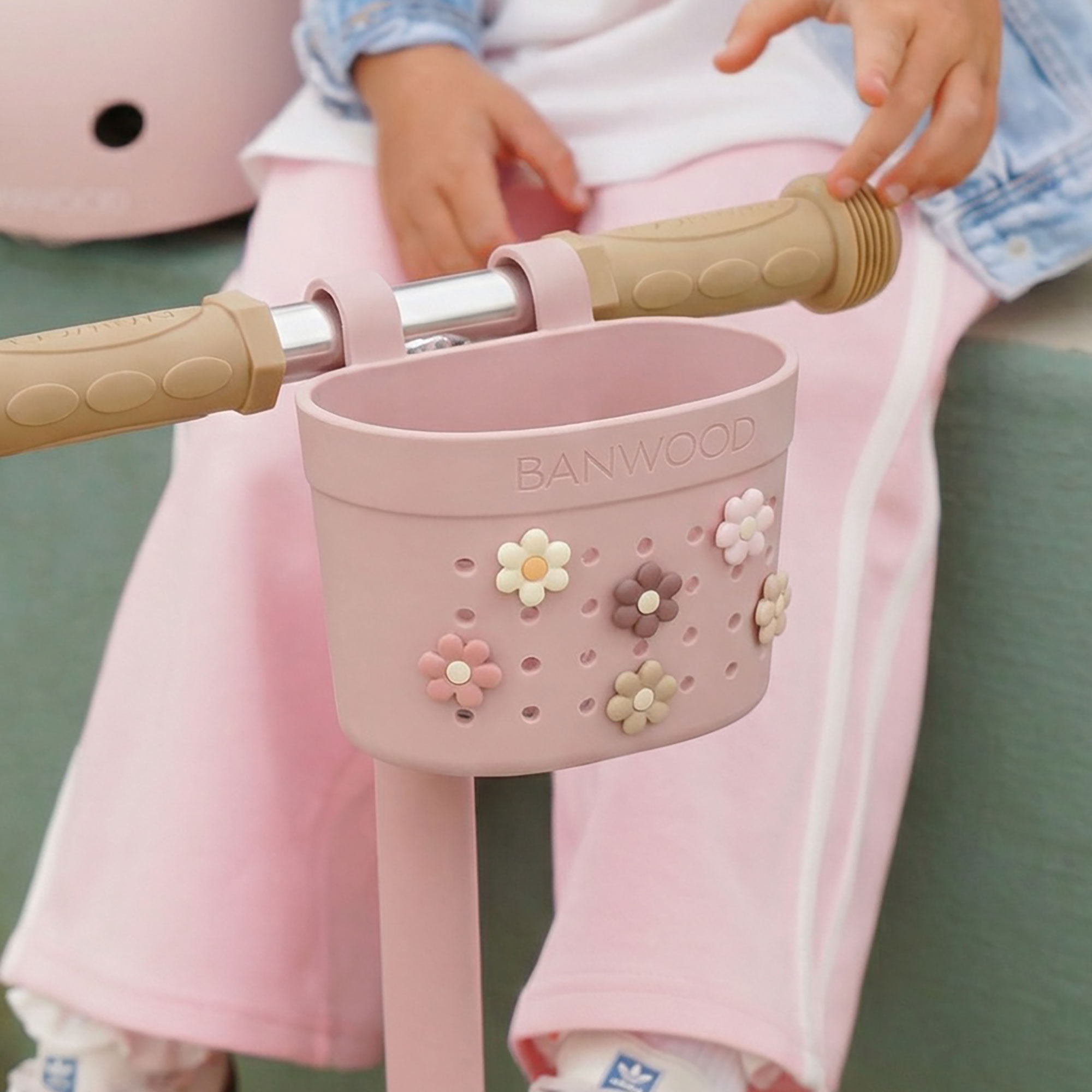 Víziou Banwood je pozitívne ovplyvňovať aktívny životný štýl detí od útleho veku. Banwood ponúka štýlové produkty v nadčasovom minimalistickom dizajne a vysokej kvalite, ktoré pomáhajú rozvíjať osobnosť detí a vytvárať spomienky na detstvo plné radosti. Milujeme spôsob, akým sa deti hrajú! Ozdoby na košík Pin & Ride od Banwood sú vyrobené tak, aby každej jazde dodali trochu osobnosti. Dajú sa jednoducho zatlačiť, vybrať a kedykoľvek vymeniť. Deti môžu kombinovať ozdoby, kým nenájdu kombináciu, ktorá sa im páči. Sú vyrobené z odolných materiálov, navrhnuté na každodenné používanie, jednoducho sa používajú a prinášajú radosť znova a znova. Vyrobené z recyklovanej, odolnej gumy. Flowers: Inšpirované jemnými tvarmi kvetov 70. rokov. Malá zmes kvetov na rozjasnenie košíka. Dinosaurus: Dinosaury pripravené vyraziť na jazdu. Pre najmenších, ktorí majú radi trochu dobrodružstva. Space: Rakety, hviezdy a malí prieskumníci. Pre jazdy plné veľkých nápadov. Magic: Jednorožce, dúhy a malé dotyky mágie. Extra zázraky do každodenných jázd.