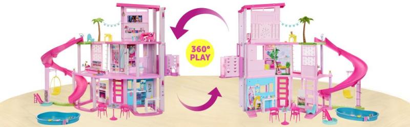 Deti môžu usporiadať dokonalú párty pri bazéne s Barbie® Domom snov™! Tento luxusný dom pre bábiky má najvyššiu šmykľavku v doterajšej sérii domov Barbie® a trojposchodovú špirálovú konštrukciu pre nekonečnú zábavu na slnku. Inšpiruje na hranie v rozsahu 360 stupňov vďaka širokému a priestrannému pôdorysu, trom podlažiam a 10 vnútorným a vonkajším obytným priestorom. Herný set obsahuje tiež viac prvkov pre domácich miláčikov ako kedykoľvek predtým, vrátane šmykľavky pre šteňatá a bazéna, kde sa chlpatí kamaráti môžu hrať spolu s bábikou Barbie®! Extra miestnosť na hornom poschodí sa premení na spaciu izbu, vďaka ktorej sa v Dome snov™ môžu vyspať štyri bábiky (bábiky Barbie® nie sú súčasťou balenia). S viac ako 75 doplnkami a prispôsobiteľnými priestormi, je výnimočným darčekom pre deti od 3 rokov. Farby a vzhľad výrobku sa môžu líšiť.