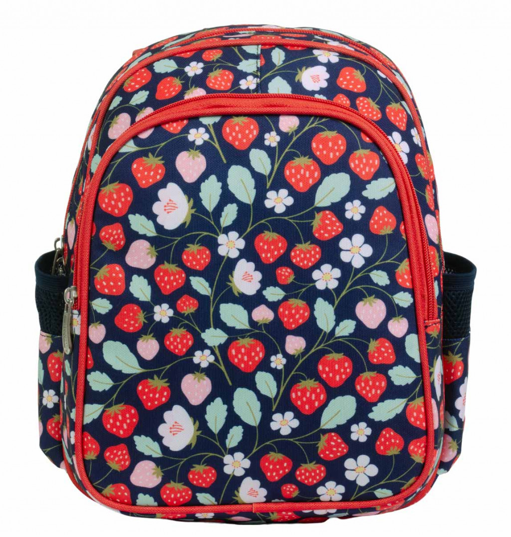 Priestorný detský tmavomodrý batoh s jahodami je ideálny do škôlky alebo na cesty. Batoh má priestornú hlavnú komoru, izolované predné vrecko na desiatu a nápoje. Fľaša na pitie sa vojde aj do jedného z dvoch bočných vreciek. Praktické sú polstrované ramenné popruhy a hrudný popruh proti šmyknutiu z ramien. Zadný panel je polstrovaný pre väčšie pohodlie a je vybavený priedušnou tkaninou. Batoh nie je vhodné prať, stačí otrieť vlhkou handričkou.