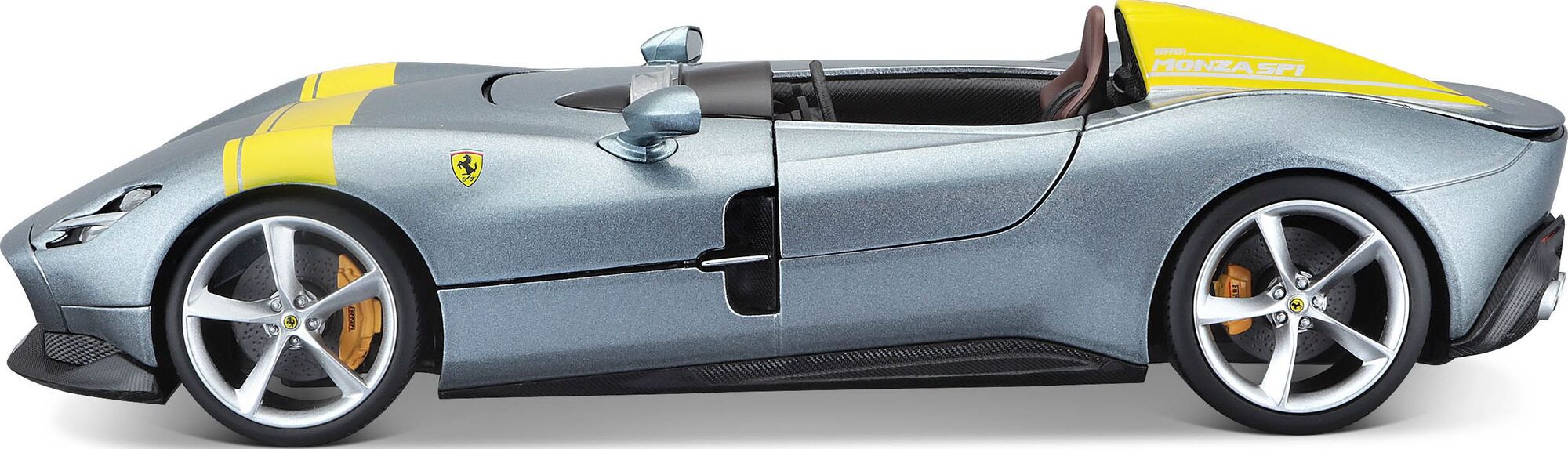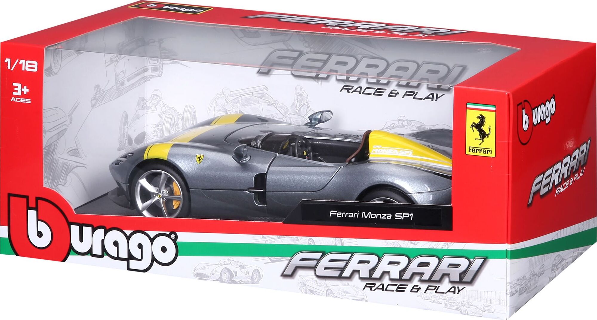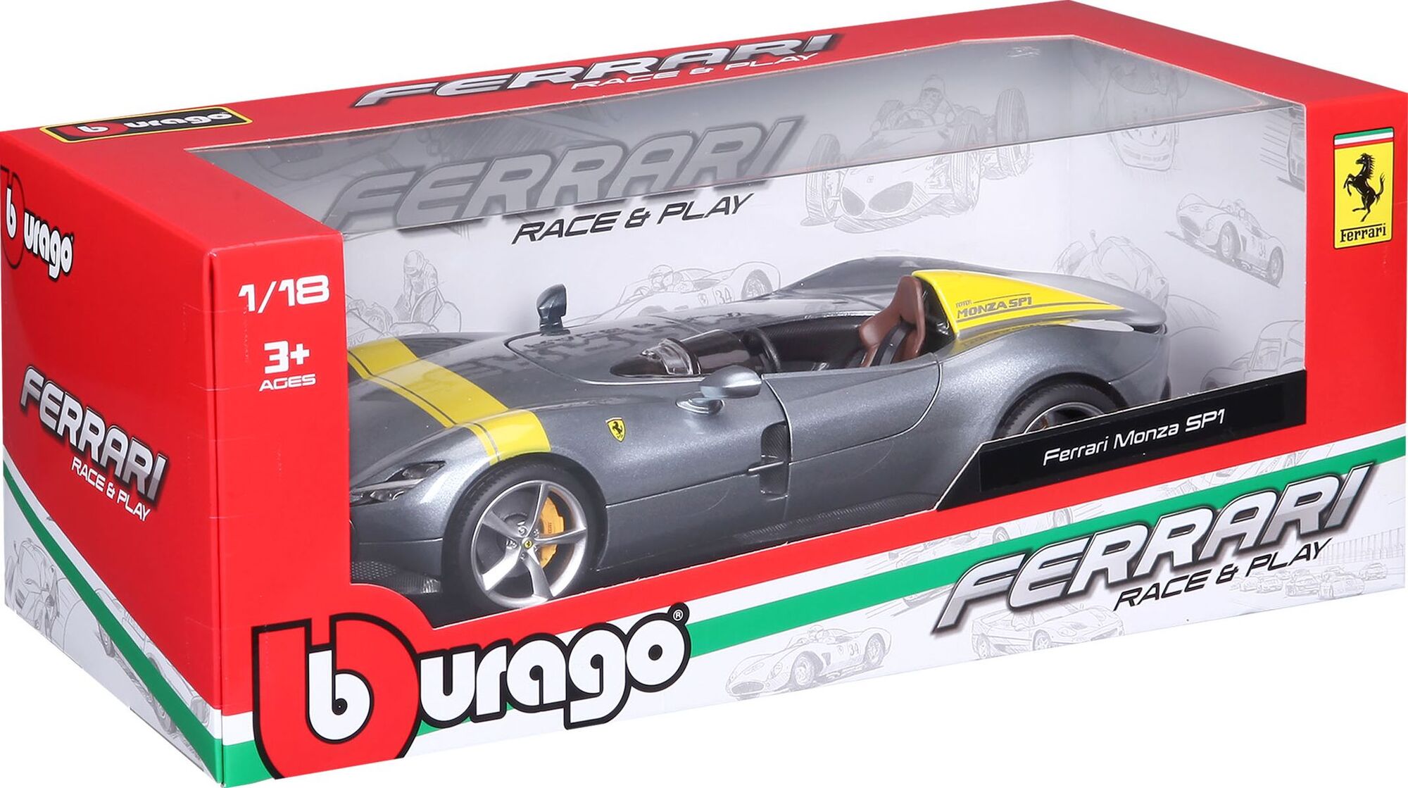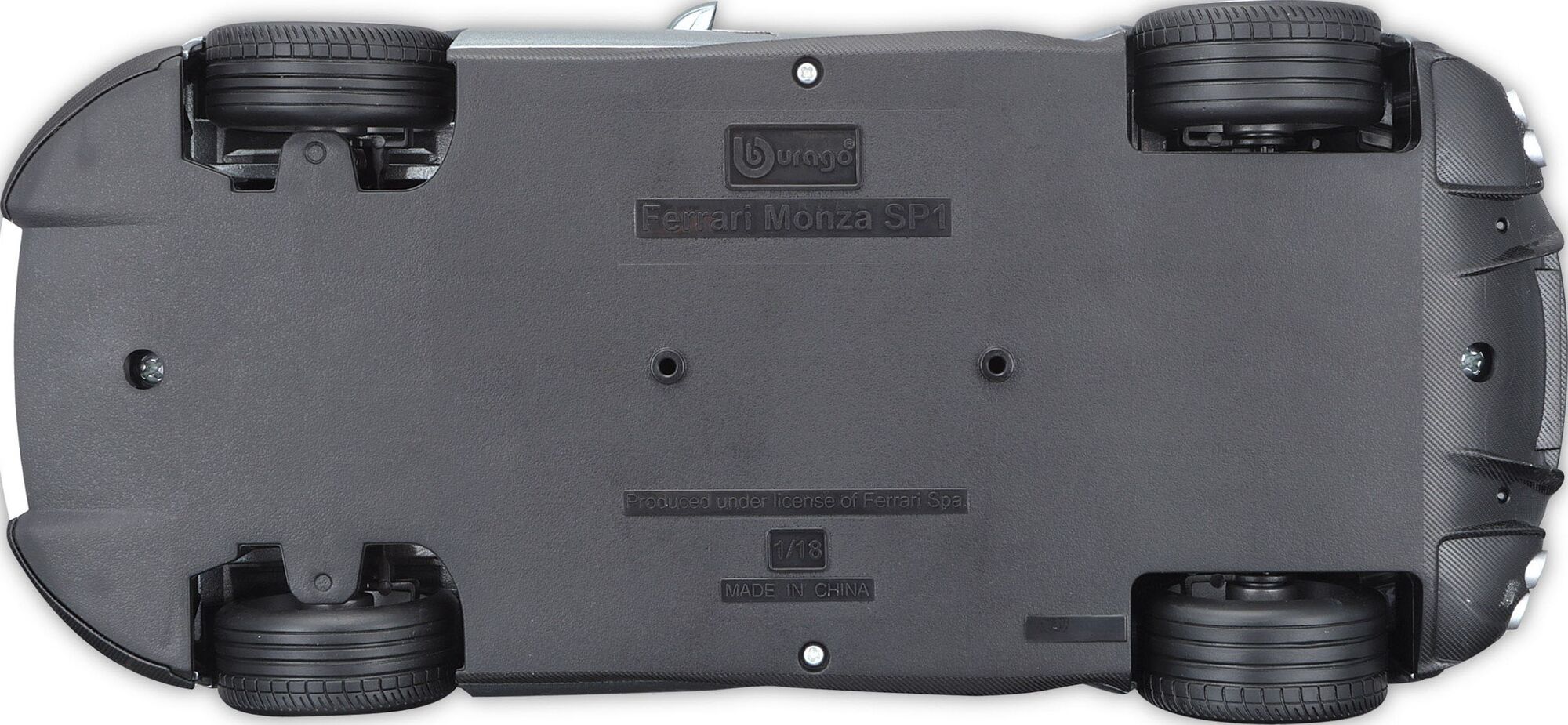 Bburago 1:18 Ferrari Monza SP1 Blue Kovový model auta 1:18 Bburago 18-16013 Ferrari Monza SP1 nielen pre zberateľov. Má odpruženú nápravu. Model je v špičkovej kvalite. Farba modelu je strieborná. Ferrari Monza SP1 a SP2 sú športové vozidlá vyrobené talianskou automobilkou Ferrari. Boli výroby v obmedzenom množstve, ktoré boli zavedené v roku 2018 pre modelový rok 2019. SP1 je jednomiestny Motor bol vyladený tak, aby generoval celkom 596 kW a max. rýchlosť 299 km/h. Podvozok voľne vychádza z modelu 812 a vozidlá SP1 a SP2 sú vybavené karosériou z uhlíkových vlákien. Vlastnosti Model má otváracie dvere a kapotu, natáčanie kolies volantom je plne funkčné. Karoséria je vyrobená zo zinkohliníkovej zliatiny. Karoséria je potlačená tampónovou tlačou kvalitnou farbou. Veľké množstvo detailov. Možné otvoriť dvere, kapotu. Detailne spracované svetlá a blinkre. Gumené pneumatiky.