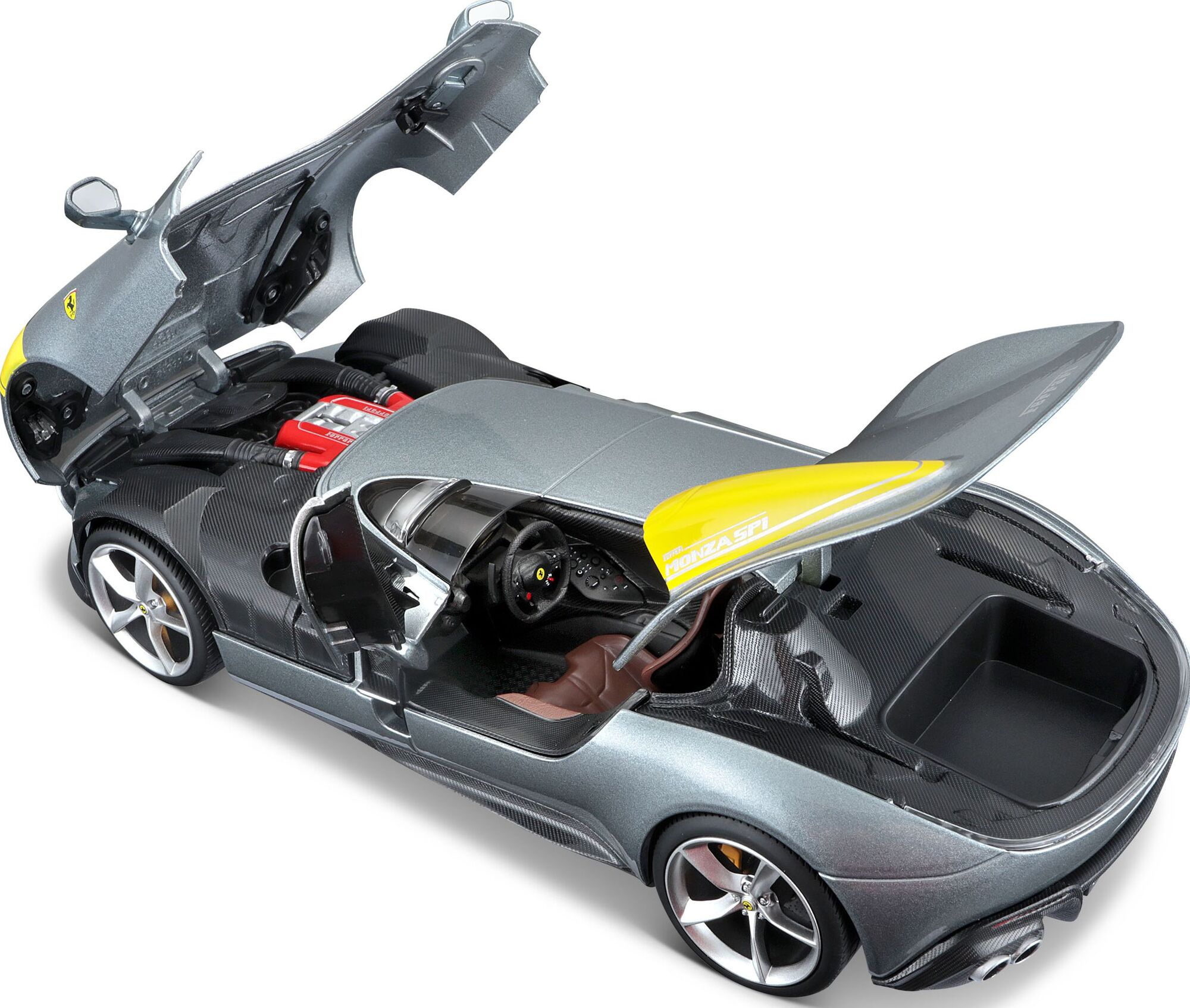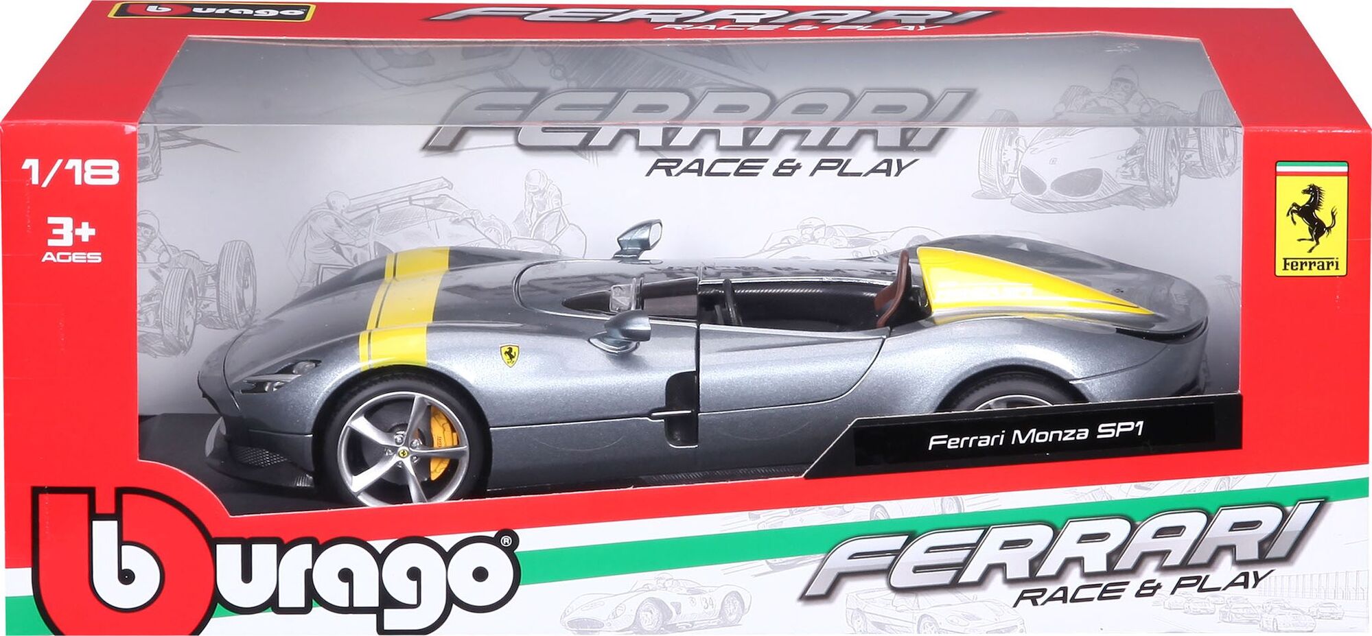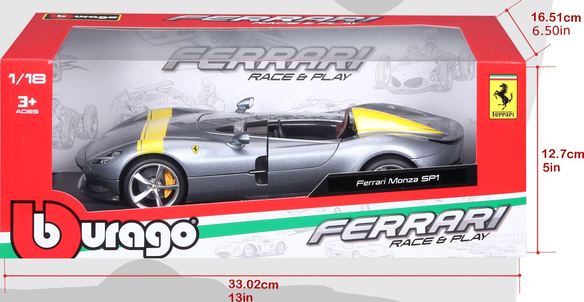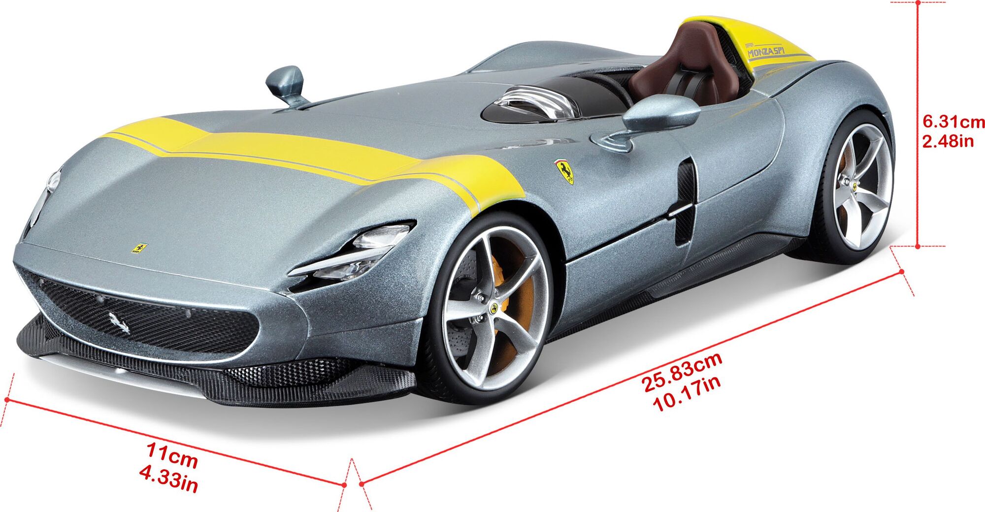 Bburago 1:18 Ferrari Monza SP1 Blue Kovový model auta 1:18 Bburago 18-16013 Ferrari Monza SP1 nielen pre zberateľov. Má odpruženú nápravu. Model je v špičkovej kvalite. Farba modelu je strieborná. Ferrari Monza SP1 a SP2 sú športové vozidlá vyrobené talianskou automobilkou Ferrari. Boli výroby v obmedzenom množstve, ktoré boli zavedené v roku 2018 pre modelový rok 2019. SP1 je jednomiestny Motor bol vyladený tak, aby generoval celkom 596 kW a max. rýchlosť 299 km/h. Podvozok voľne vychádza z modelu 812 a vozidlá SP1 a SP2 sú vybavené karosériou z uhlíkových vlákien. Vlastnosti Model má otváracie dvere a kapotu, natáčanie kolies volantom je plne funkčné. Karoséria je vyrobená zo zinkohliníkovej zliatiny. Karoséria je potlačená tampónovou tlačou kvalitnou farbou. Veľké množstvo detailov. Možné otvoriť dvere, kapotu. Detailne spracované svetlá a blinkre. Gumené pneumatiky.