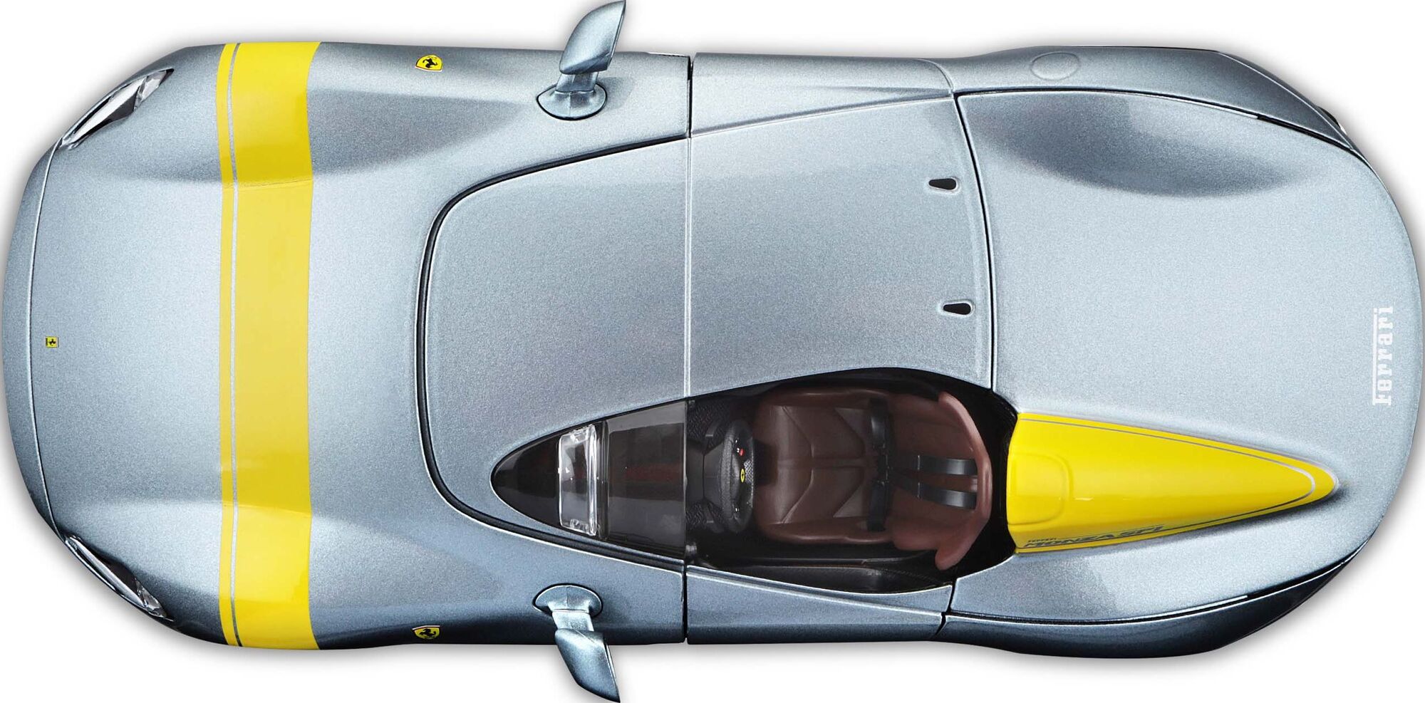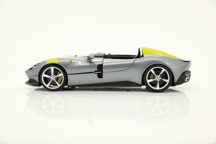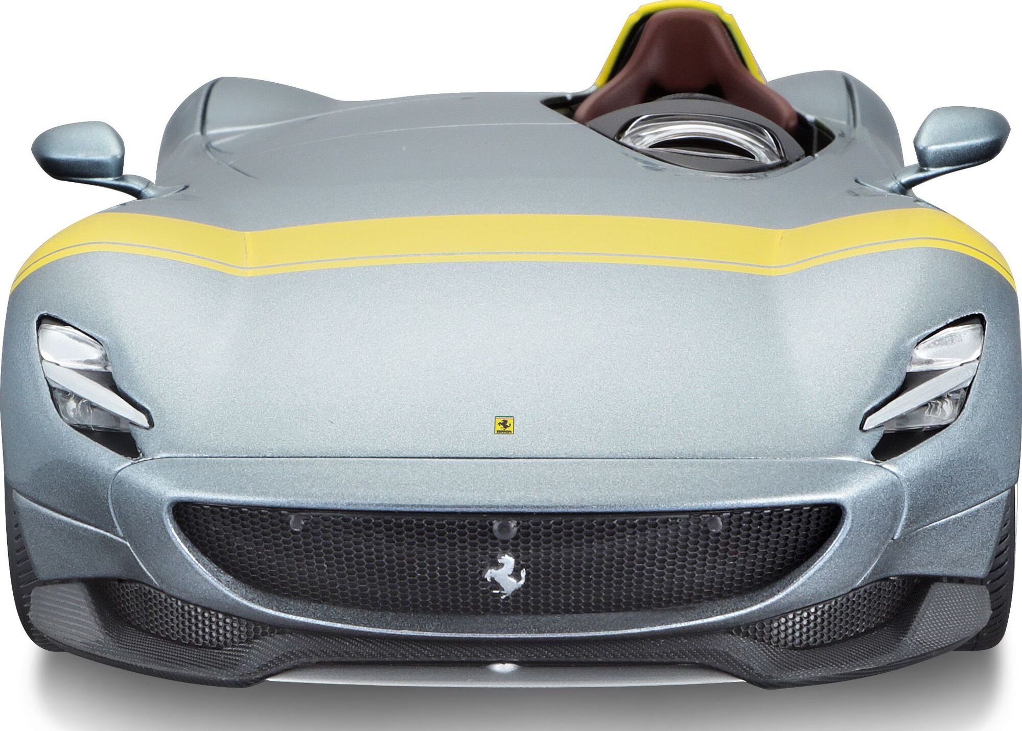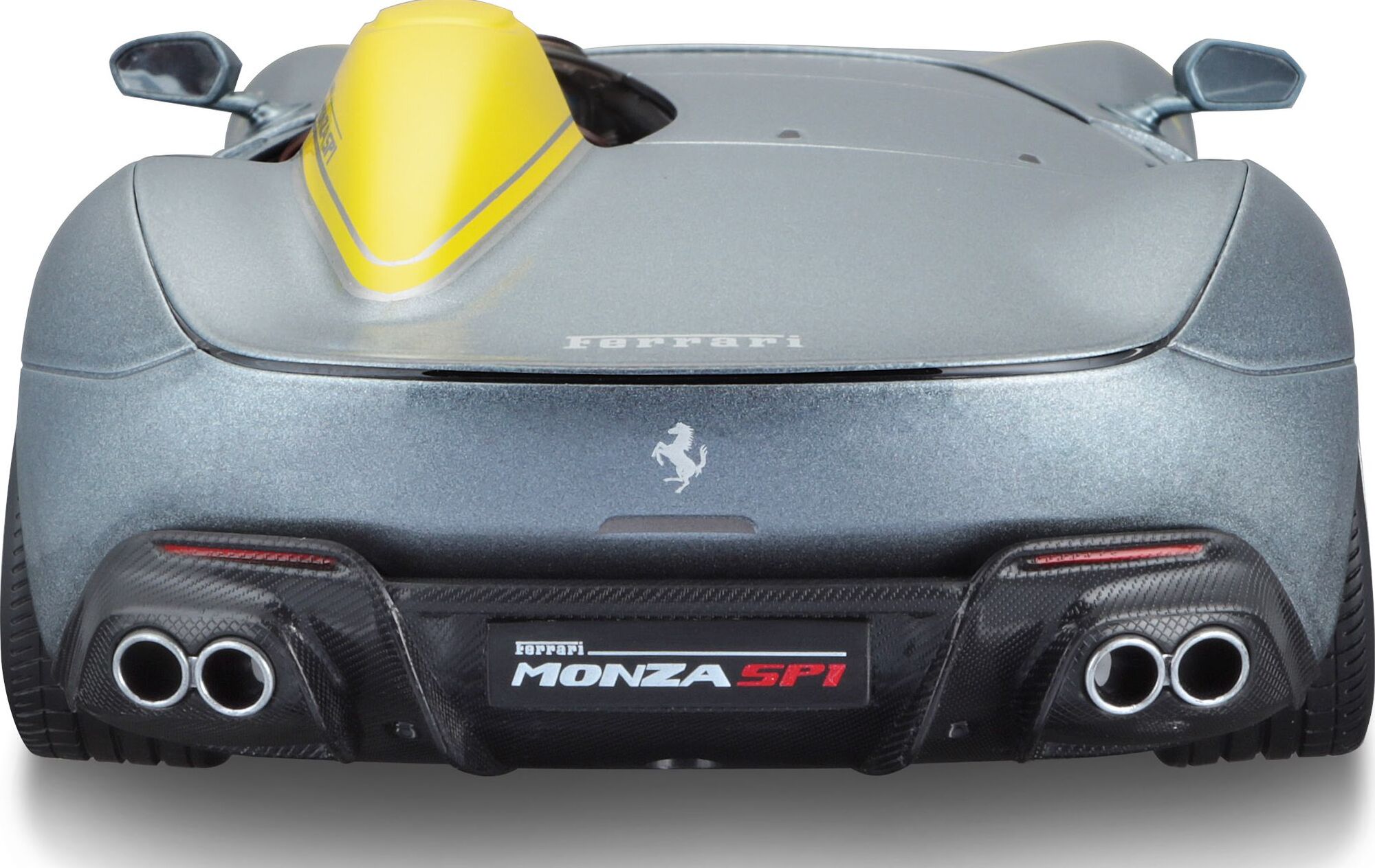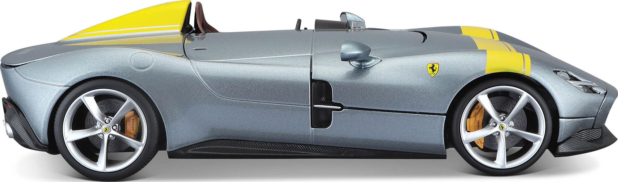 Bburago 1:18 Ferrari Monza SP1 Blue Kovový model auta 1:18 Bburago 18-16013 Ferrari Monza SP1 nielen pre zberateľov. Má odpruženú nápravu. Model je v špičkovej kvalite. Farba modelu je strieborná. Ferrari Monza SP1 a SP2 sú športové vozidlá vyrobené talianskou automobilkou Ferrari. Boli výroby v obmedzenom množstve, ktoré boli zavedené v roku 2018 pre modelový rok 2019. SP1 je jednomiestny Motor bol vyladený tak, aby generoval celkom 596 kW a max. rýchlosť 299 km/h. Podvozok voľne vychádza z modelu 812 a vozidlá SP1 a SP2 sú vybavené karosériou z uhlíkových vlákien. Vlastnosti Model má otváracie dvere a kapotu, natáčanie kolies volantom je plne funkčné. Karoséria je vyrobená zo zinkohliníkovej zliatiny. Karoséria je potlačená tampónovou tlačou kvalitnou farbou. Veľké množstvo detailov. Možné otvoriť dvere, kapotu. Detailne spracované svetlá a blinkre. Gumené pneumatiky.
