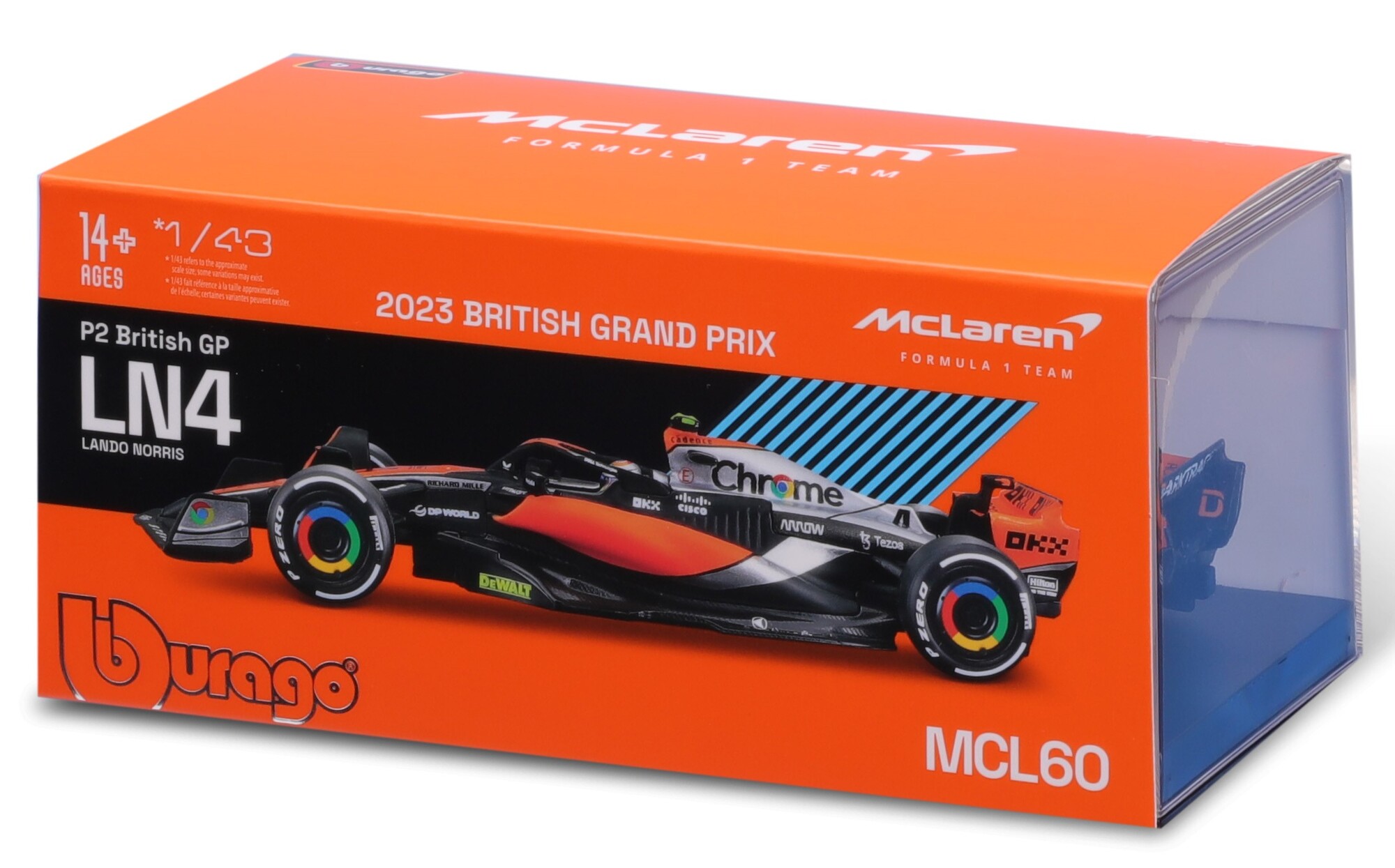 Bburago 1:43 RACE Formula F1 - McLaren F1 Team MCL60 (2023) #4 (Lando Norris) - with driver and decorative box