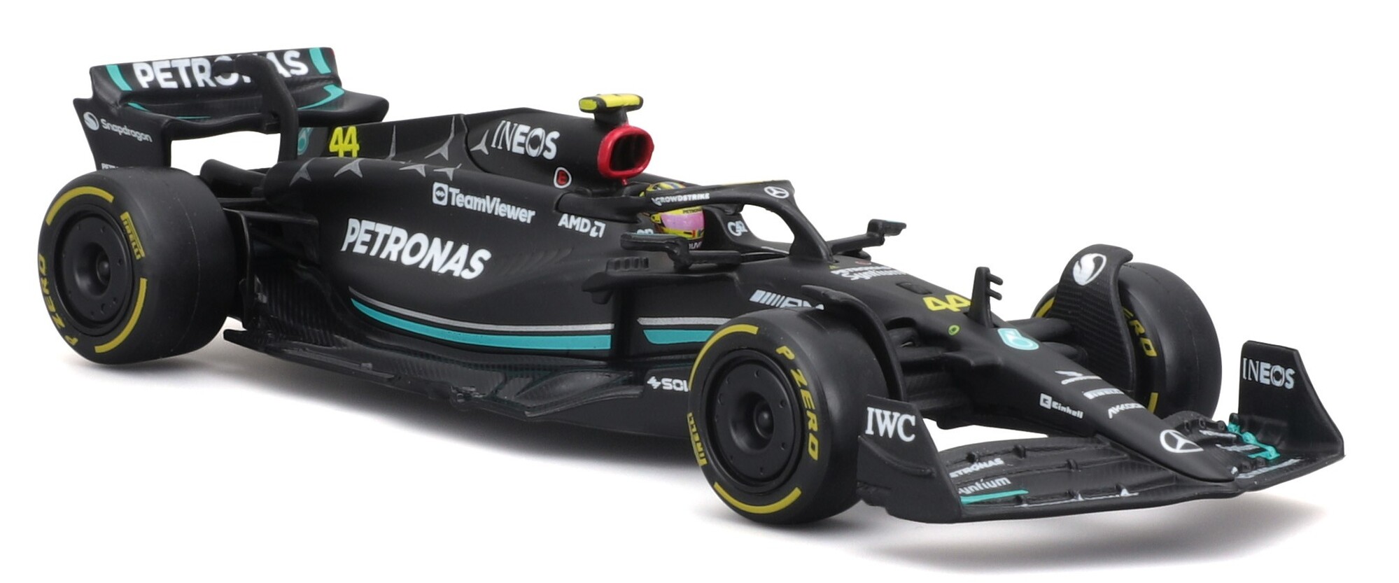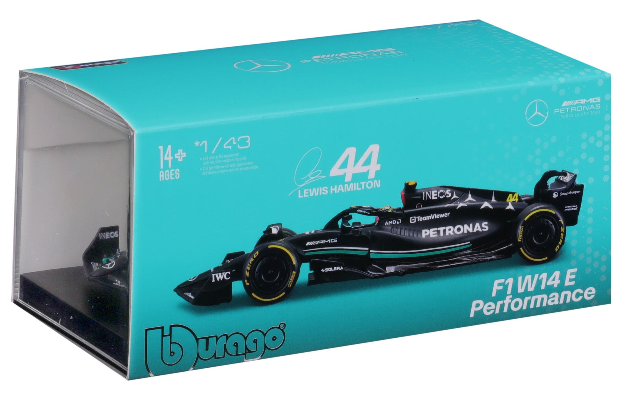 Bburago 1:43 RACE Formula F1 - Mercedes-AMG F1 W14 E Performance (2023) #44 (Lewis Hamilton) - with driver and decorative box