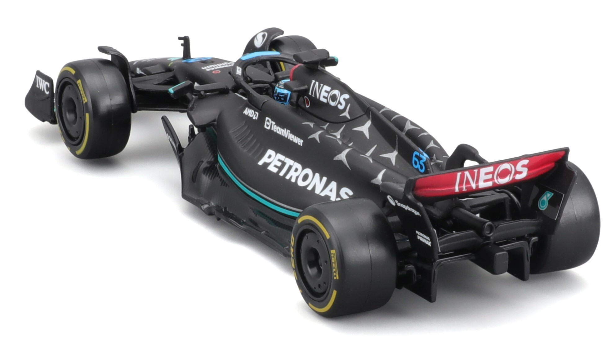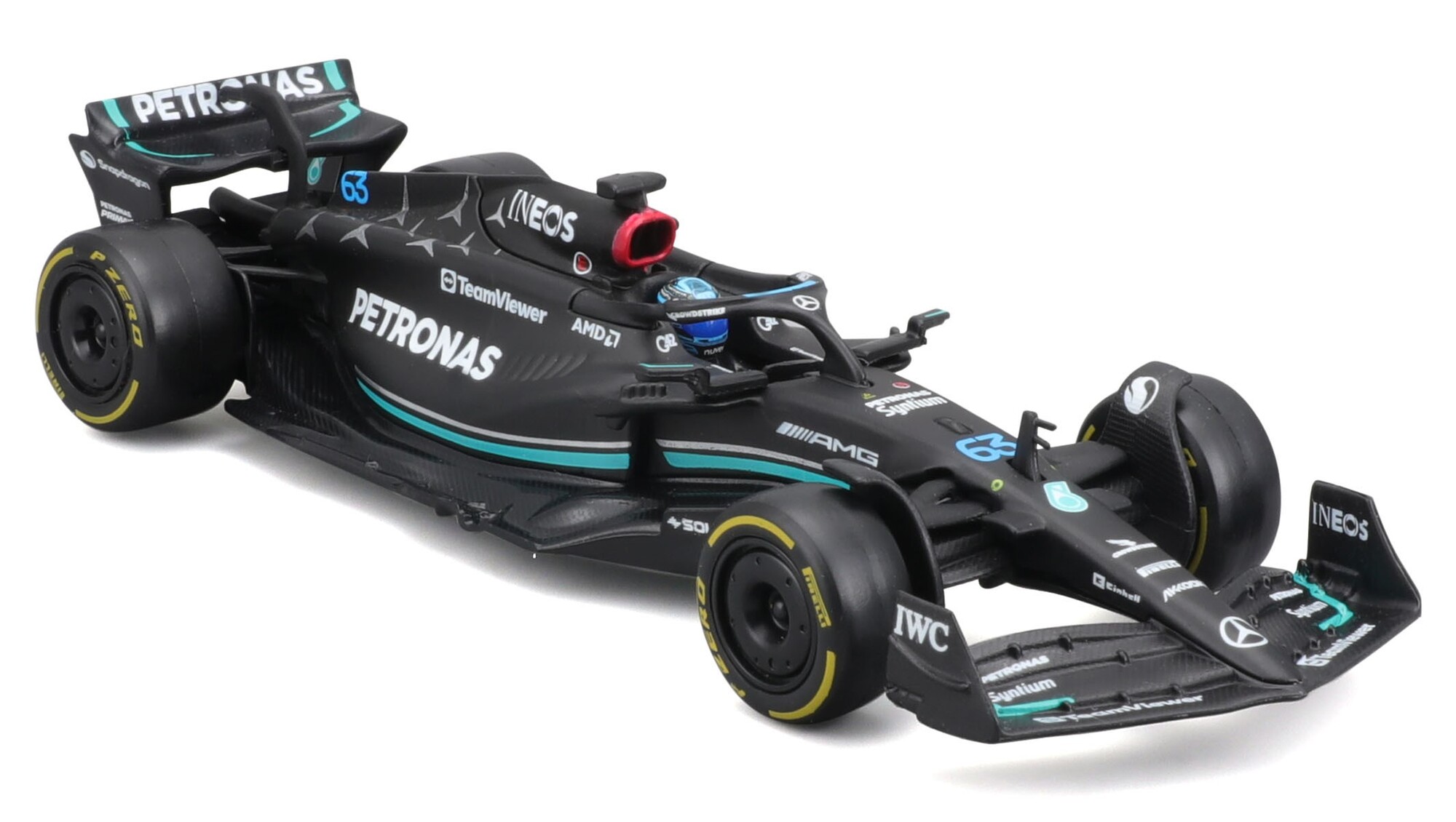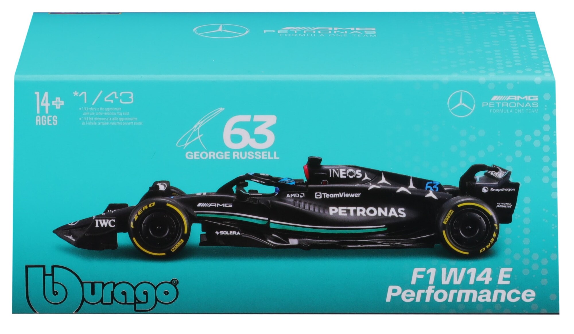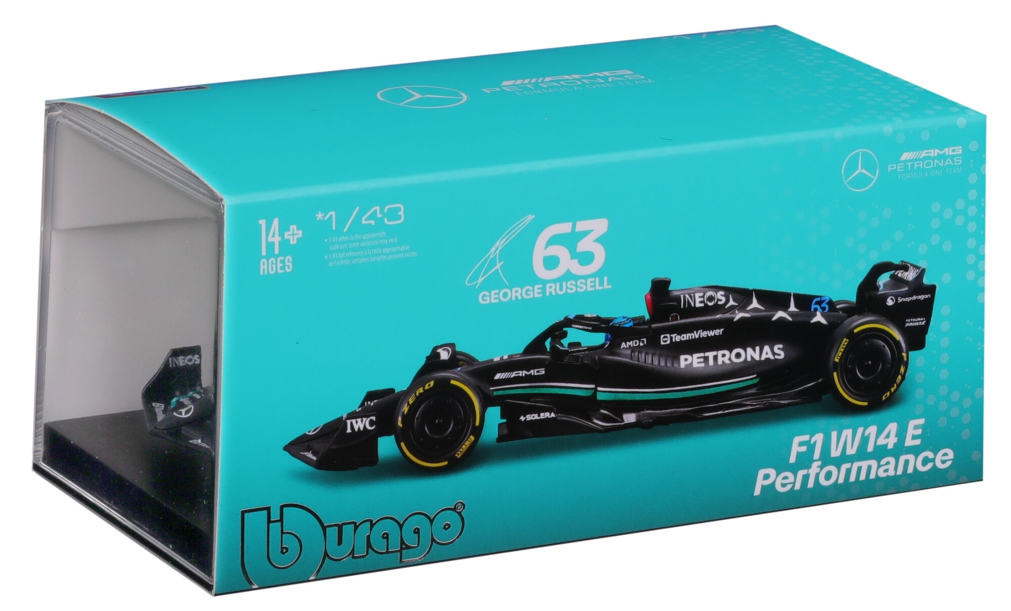 Bburago 1:43 RACE Formula F1 - Mercedes-AMG F1 W14 E Performance (2023) #63 (George Russell) - with driver and decorative box