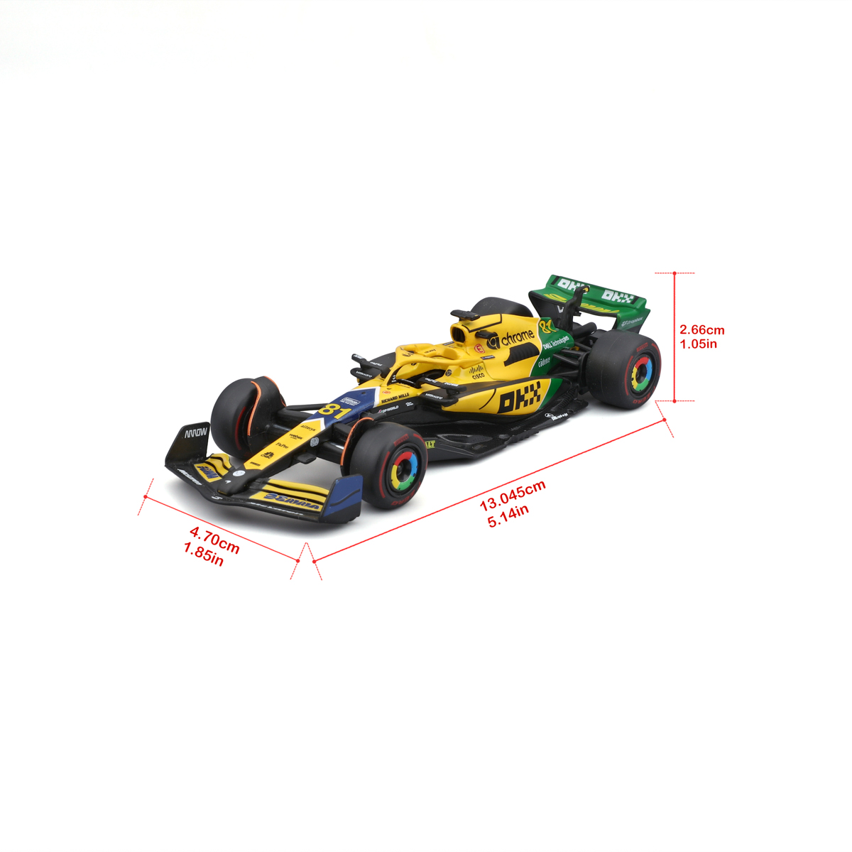 Bburago modely závodných vozidiel Formule 1 v mierke 1:43 z kolekcie RACE sú zbierkou krásneho designu s vysokým dôrazom na presnosť detailov. Modely F1 zo stajne McLaren MCL38 (2024) v špeciálnej Senna Edition sú vyrobené z liateho kovu s plastovými detailmi. Každý z modelov je v klasickom závodnom designe a so závodným číslom. Balené v krabičke. Nevhodné pre deti do 3 rokov. Rozmery balenia: 6,7 x 14,7 x 7,5 cm. Vek: 3+