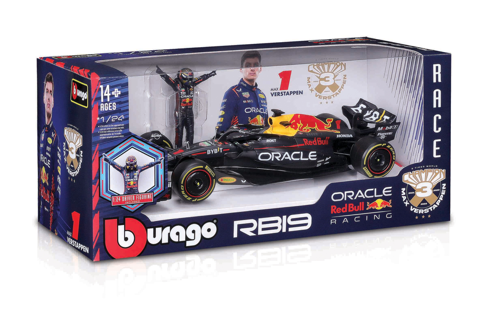 Bburago modely závodných vozidiel Formule 1 v mierke 1:24 z kolekcie RACE sú zbierkou krásneho designu s vysokým dôrazom na presnosť detailov. Súčasťou modelov je plastová figúrka jazdca F1 v majstrovskej póze. Modely F1 zo stajne Oracle Red Bull Racing RB19 (2023) sú vyrobené z liateho kovu s plastovými detailmi. Každý z modelov je v klasickom závodnom designe a so závodným číslom. Balené v krabičke. Nevhodné pre deti do 3 rokov. Rozmery balenia: 12,7 x 28 x 12,7 cm. Vek: 14+
