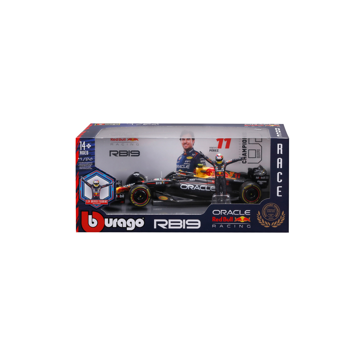 Bburago modely závodných vozidiel Formule 1 v mierke 1:24 z kolekcie RACE sú zbierkou krásneho designu s vysokým dôrazom na presnosť detailov. Súčasťou modelov je plastová figúrka jazdca F1 v majstrovskej póze. Modely F1 zo stajne Oracle Red Bull Racing RB19 (2023) sú vyrobené z liateho kovu s plastovými detailmi. Každý z modelov je v klasickom závodnom designe a so závodným číslom. Balené v krabičke. Nevhodné pre deti do 3 rokov. Rozmery balenia: 12,7 x 28 x 12,7 cm. Vek: 14+