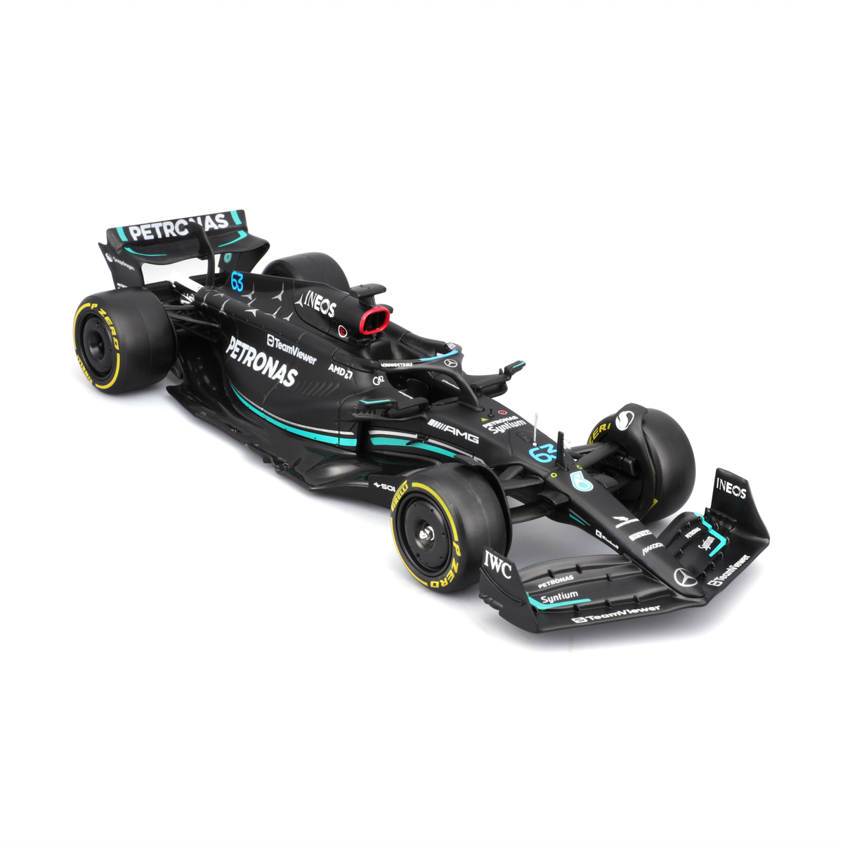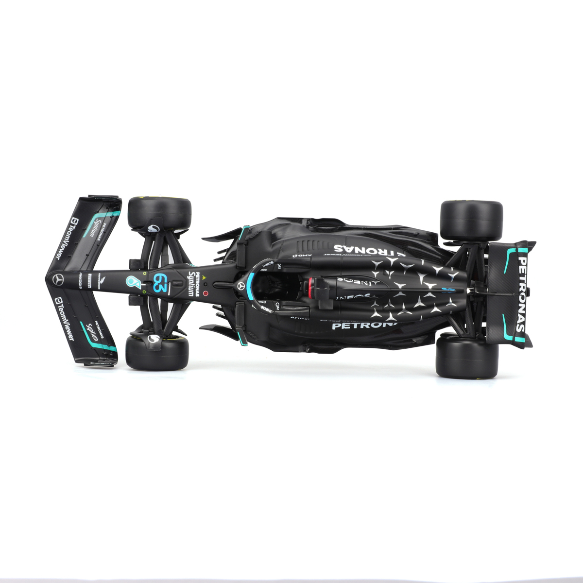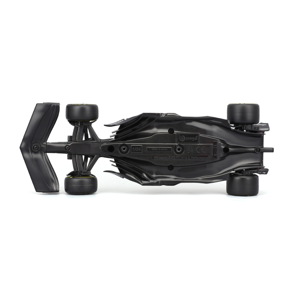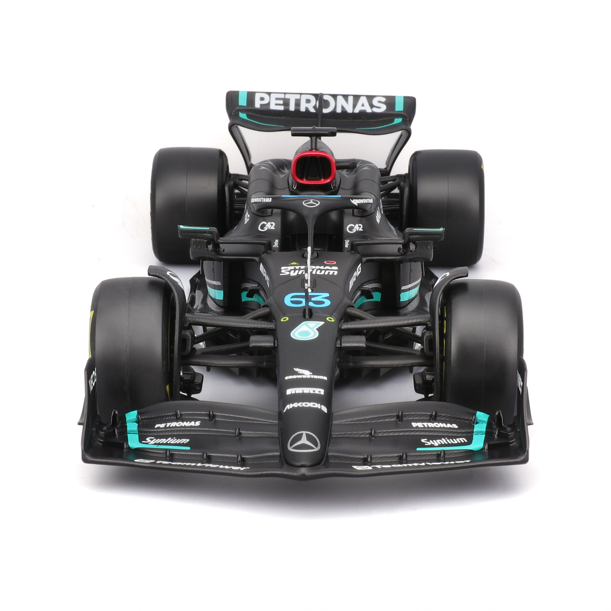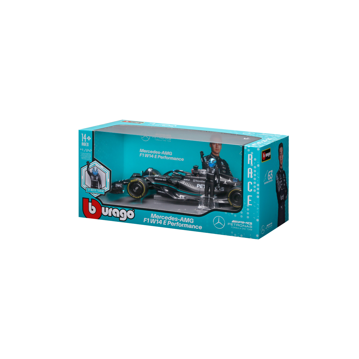 Bburago modely závodných vozidiel Formule 1 v mierke 1:24 z kolekcie RACE sú zbierkou krásneho designu s vysokým dôrazom na presnosť detailov. Súčasťou modelov je plastová figúrka jazdca F1 v majstrovskej póze. Modely F1 zo stajne Mercedes-AMG Petronas Team W14 E Performance (2023) sú vyrobené z liateho kovu s plastovými detailmi. Každý z modelov je v klasickom závodnom designe a so závodným číslom. Balené v krabičke. Nevhodné pre deti do 3 rokov. Rozmery balenia: 12,7 x 28 x 12,7 cm. Vek: 14+
