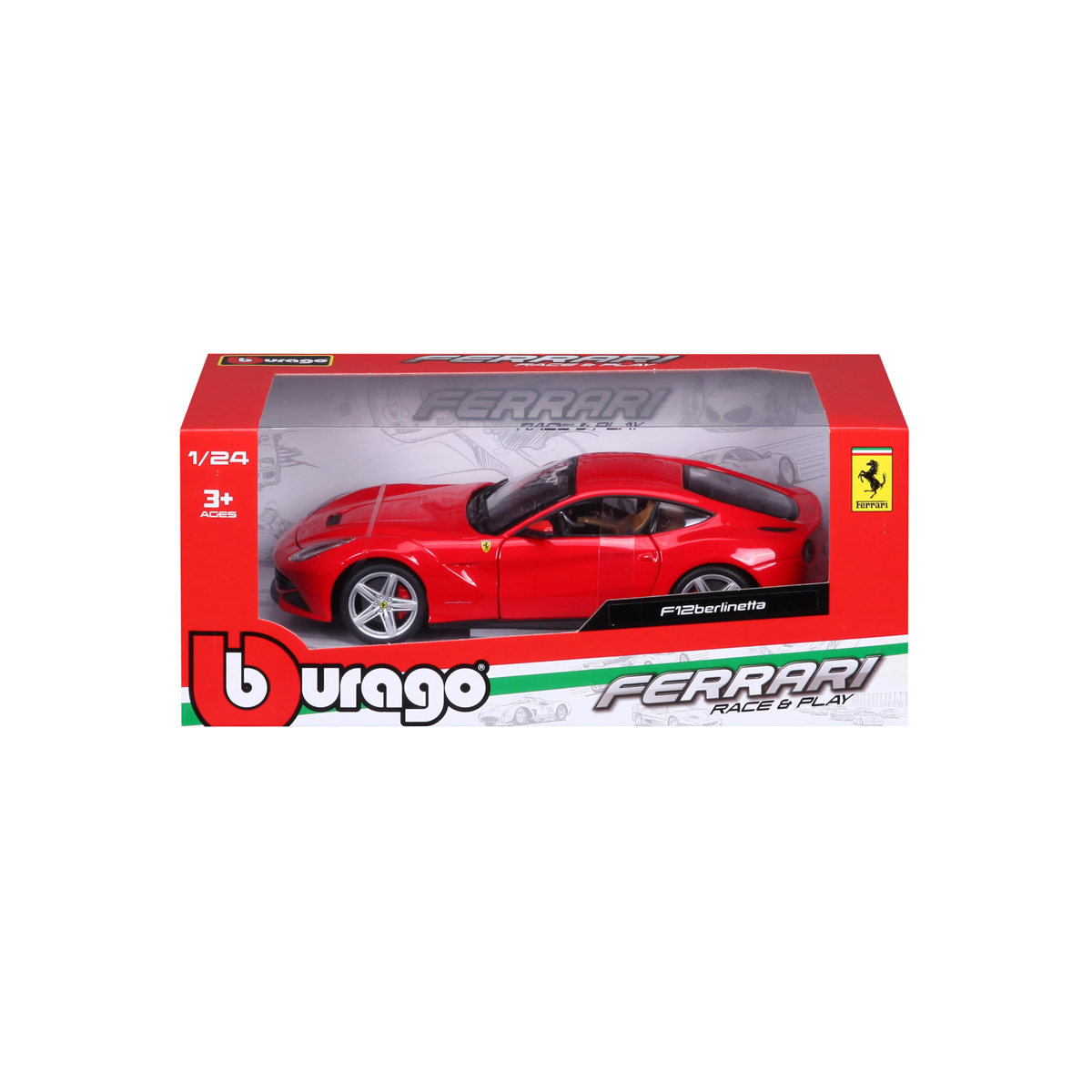 Modely automobilov Ferrari v mierke 1:24 z kolekcie RACE+PLAY sú zbierkou krásneho designu s vysokým dôrazom na presnosť detailov. Modely sú vyrobené z liateho kovu s plastovými detailmi. Väčšina modelov z kolekcie má otváracie dvere, kufor alebo kapotu. Niektoré z modelov majú pohyblivý volant. Balené v krabičke. Nevhodné pre deti do 3 rokov. Rozmery balenia: 10,3 x 25 x 12,6 cm. Vek: 3+