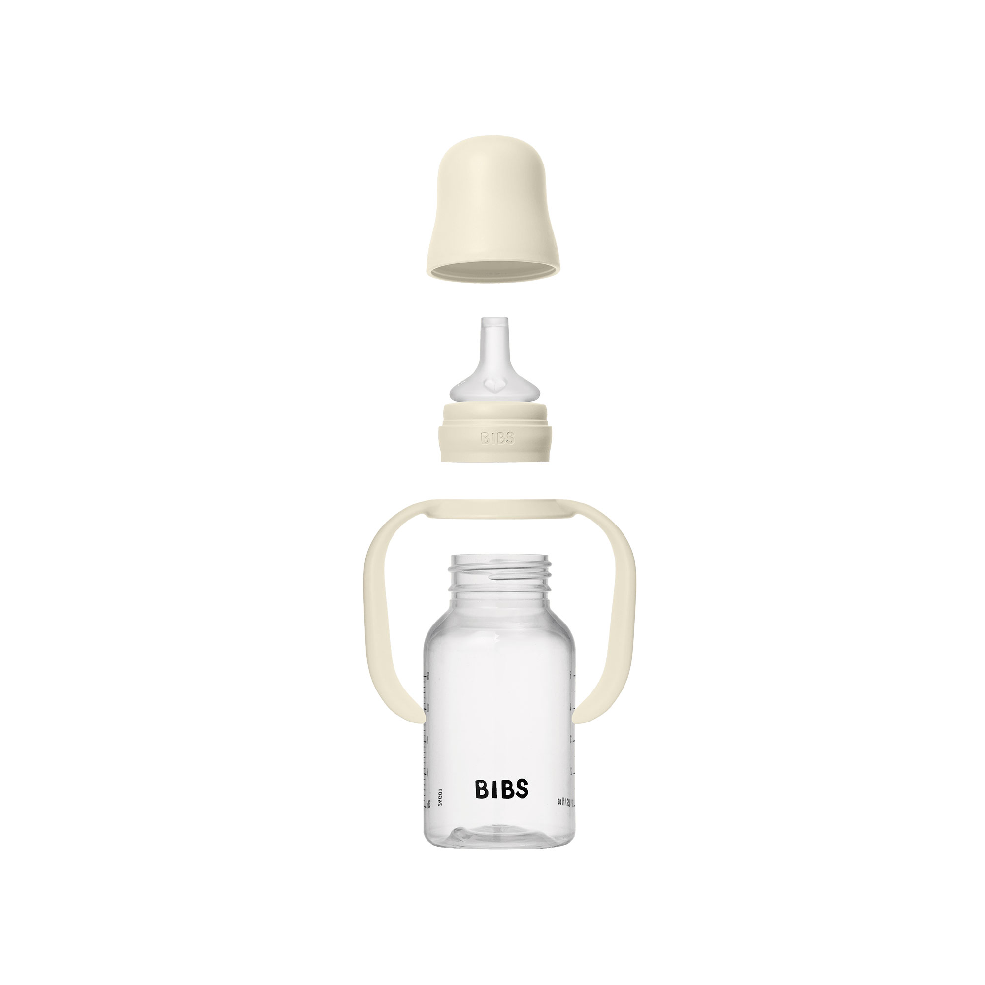 BIBS je obľúbená dánska značka s tradíciou výroby ikonických cumlíkov od roku 1978. Okrem cumlíkov BIBS ponúka aj pestrý prémiový sortiment pre najmenšie deti v minimalistickom škandinávskom dizajne a širokej farebnej palete. BIBS detská fľaša s náustkom slúži ako tréningový pohárik, pomáha pri prechode z používania dojčenskej fľaše k pitiu z otvoreného pohára. Praktické ušká uľahčujú deťom manipuláciu s fľašou, deti si tak rozvíjajú jemnú motoriku a samostatnosť pri pití. Mäkký silikónový náustok s membránou je jemný a šetrný k ďasnám a udržiava tekutý obsah bezpečne vo vnútri fľaše. Anti-Colic dizajn – unikátny antikolikový ventil v tvare srdiečka pomáha predchádzať plynatosti a podporuje plynulý tok tekutiny pre šťastnejšie brušká. Mäkký náustok z hypoalergénneho silikónu medicínskej kvality, s pridanými výstužami pre väčšiu odolnosť. Jednoduché a pohodlné uchopenie vďaka rúčkam / uškám na fľašu, protišmykový povrch. Všetky komponenty sú vyrobené bez BPA a ftalátov. Jednoduché čistenie – vhodné aj do umývačky riadu (okrem cumlíka). Vhodné pre deti vo veku od 6 mesiacov. Fľaša je kompatibilná aj s doplnkami a cumlíkmi dojčenských fliaš BIBS. OBSAH BALENIA: Plastová fľaša z potravinárskeho PP bez obsahu BPA a ftalátov – 150ml. Náustok z hypoalergénneho silikónu medicínskej kvality. Objímka. Vrchnák. Ušká na fľašu. POUŽITIE:   Pred prvým použitím výrobok rozoberte a všetky časti sterilizujte vo vriacej vode po dobu 5 minút. Neskôr sterilizujte podľa potreby. Po každom použití výrobok rozoberte, všetky časti umyte a nechajte dôkladne vyschnúť. Všetky časti okrem silikónového náustku je možné umývať v umývačke riadu. V mikrovlnnej rúre je možné používať iba samotné telo fľaše. BIBS detská fľaša s náustkom spĺňa európsku normu EN 14350.