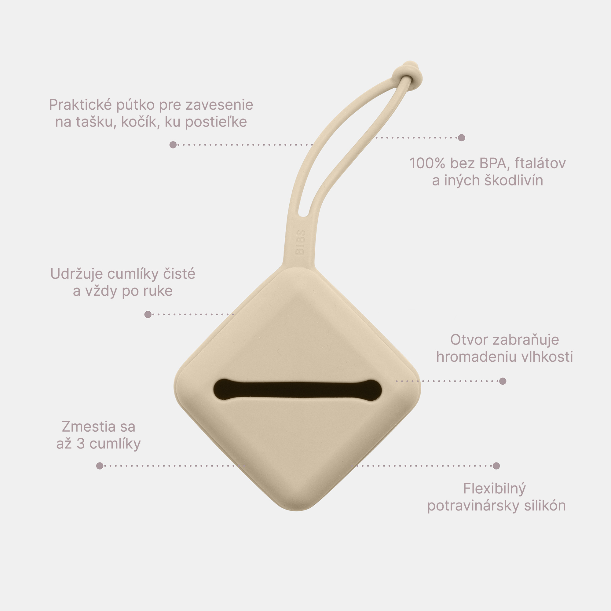 BIBS je obľúbená dánska značka s tradíciou výroby ikonických cumlíkov od roku 1978. Okrem cumlíkov BIBS ponúka aj pestrý prémiový sortiment pre najmenšie deti v minimalistickom škandinávskom dizajne a širokej farebnej palete. Všetky BIBS produkty sú garanciou najvyššej kvality detského sortimentu.   Rozlúčte sa so stratenými alebo špinavými cumlíkmi. BIBS silikónové puzdro na cumlíky poskytuje pohodlné a hygienické riešenie na uloženie a prepravu cumlíkov bez toho, aby sa stratili či zašpinili. Vďaka šikovnému silikónovému pútku si BIBS silikónové puzdro ľahko pripevníte na tašku, kočík, ku postieľke, či autosedačke.   Puzdro je vyrobené zo 100 %25 bezpečného potravinárskeho silikónu – bez BPA a ftalátov, vďaka čomu má dlhú životnosť a ľahko sa čistí. Zmestia sa doň až 3 cumlíky a je vhodné na všetky typy cumlíkov.   Zmestia sa až 3 cumlíky. Vhodné na všetky typy cumlíkov. Praktické pútko na zavesenie kdekoľvek. Otvor, vďaka ktorému sa vnútri nehromadí vlhkosť. Vyrobené zo 100%25 bezpečného potravinárskeho silikónu.   Údržba: Umyte teplou vodou, prípadne saponátom a dôkladne opláchnite a osušte.   Rozmery: 7,5 cm x 7,5 cm x 5 cm.