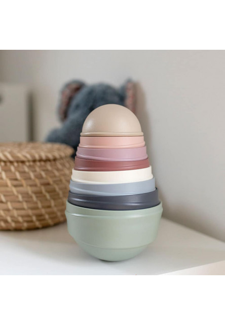 BIBS Wobbly Tower stohovacia balančná veža je rozvojová hračka s nekonečnými možnosťami využitia – len fantázia určuje hranice. Stohovanie, vyvažovanie, vkladanie, hra v piesku, či vode, prelievanie cez drobné otvory,… Vrchná gulička je zároveň hrkálkou. Praktická hračka, ktorá stimuluje rôzne zmysly a podporuje rozvoj jemnej motoriky.