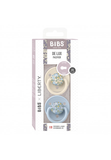 BIBS x LIBERTY je exkluzívna kolekcia najobľúbenejších BIBS produktov s potlačou Liberty. Liberty inšpiruje svet svojou výstrednosťou, nadčasovou eleganciou a prepožičiava svoje originálne vzory luxusným módnym značkám už od roku 1875. V kolekcii BIBS x LIBERTY sme spojili svoje sily, aby sme Vám priniesli produkty, ktoré oslavujú dedičstvo oboch značiek. BIBS dobývajú celý svet. Jednoduché a štýlové. BIBS De Lux je klasický guľatý cumlík s minimalistickým vzhľadom a moderným matným povrchom v krásnej farebnej ponuke jemných, pastelových, zemitých aj neutrálnych tónov, teraz aj s potlačou Liberty. Cumlík je navrhnutý tak, aby nedráždil citlivú pokožku bábätka. Okrúhly krúžok s vetracími otvormi má klenutý tvar, takmer vôbec sa nedotýka pokožky okolo úst, tá preto zostáva kľudná, bez otlačkov a podráždení. Vďaka zabudovanému vzduchovému ventilu dieťa cumlík ľahko stláča a formuje v ústach, čím je zachovaný prirodzený vývin podnebia, ďasien a zúbkov detí. Zloženie: Sacia časť: 100%25 silikón najvyššej kvality Ostatné časti: polypropylén (PP) Bez BPA, PVC, ftalátov a iných škodlivých látok. Vyrobené v Dánsku. V súlade s európskym štandardom EN 1400+A2. Veľkosti: BIBS x LIBERTY De Lux silikónové cumlíky sú k dispozícii v jednej univerzálnej veľkosti 0-3 roky.