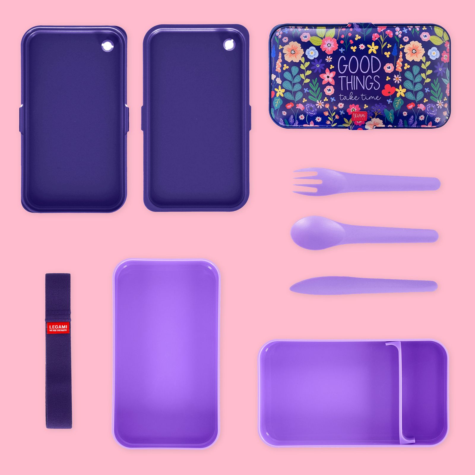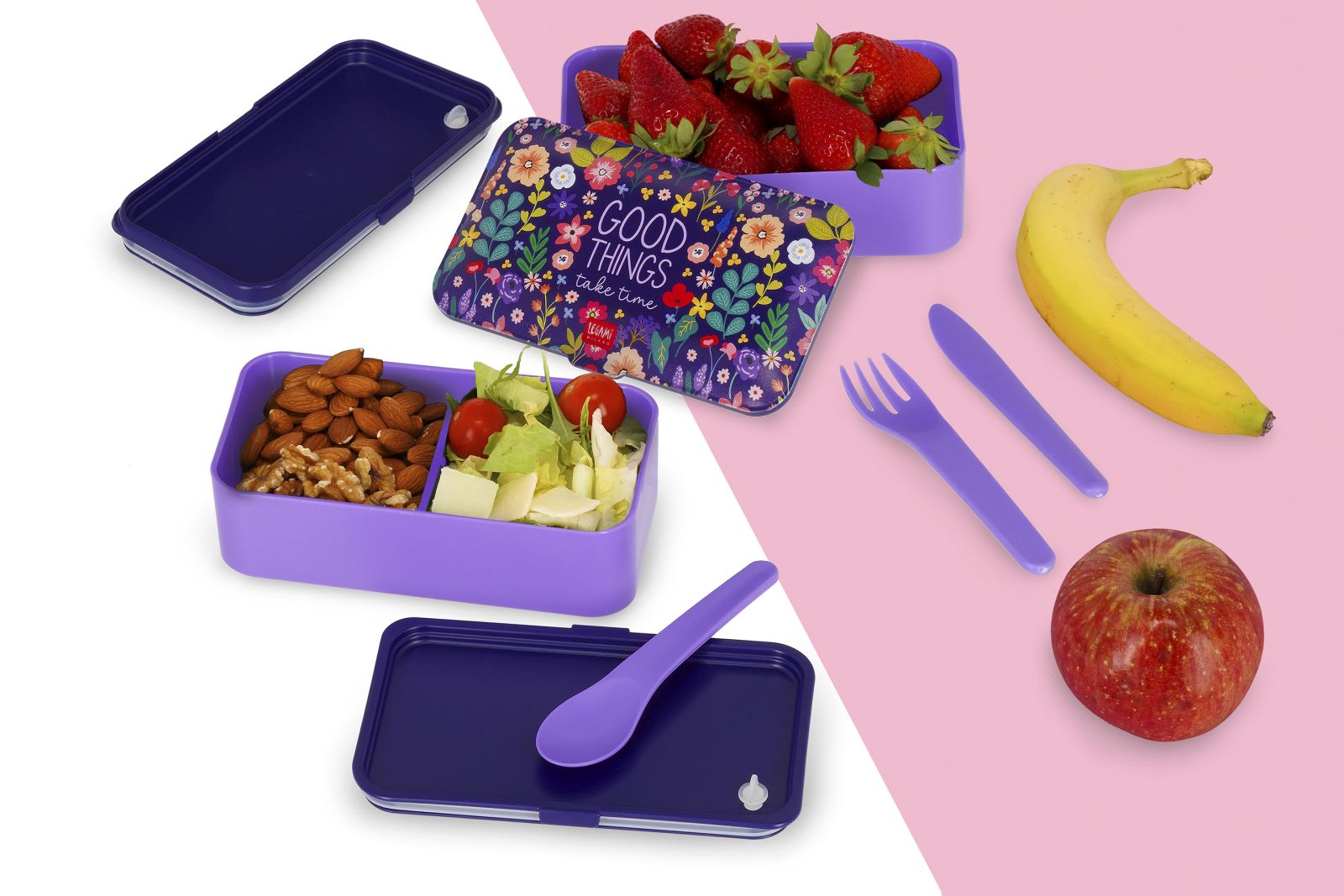 Krabička na desiatu Legami Lunch Box 1200 ml obsahuje dve nepriepustné nádoby s príbormi a elastickým popruhom na zaistenie.