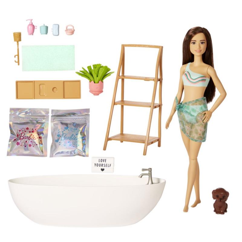 Tento herný set Barbie® Bábika a kúpeľ s mydlovými konfetami s vaňou a bábikou Barbie® obsahuje Barbie® bábiku oblečenú do plaviek s roztomilým sarongom, ktorá je polohovateľná a dodáva sa s množstvom doplnkov, ako sú vaňa a podnos, uterák, kefy, šteniatko a ďalšie. Súčasťou balenia sú dva vrecká konfetového mydla (ružové a modré), ktoré zmenia farbu vody vo vani! Bábika nevie samostatne stáť.