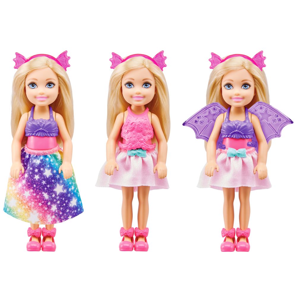 Detské predstavy sa môžu s Chelsea™ herným setom premiestniť zo zeme do neba a mora. S 12timi módnymi kúskami môžu deti obliecť Chelsea™ ako princeznú, jednorožca, morskú pannu alebo ju môžu premeniť v draka. A pokiaľ budú chcieť vytvoriť vlastnú postavu, stačí skombinovať niektoré z oblečkov. Môžu jej obliecť hviezdnu sukňu a chlpatý vŕšok, a vytvoriť princeznú, alebo Chelsea™ premenia v morskú pannu s ligotajúcim sa chvostom a prichytením vŕšku. Sukňu je možné vymeniť za jednorožčí chvost a to spárovať s dračími krídlami a čelenkou. S 12timi módnymi kúskami existuje toľko možností, ako rozvíjať predstavivosť. Bábika nevie samostatne stáť. Farby a vzhľad výrobku sa môžu líšiť. Vhodné pre deti od 3 do 7 rokov.