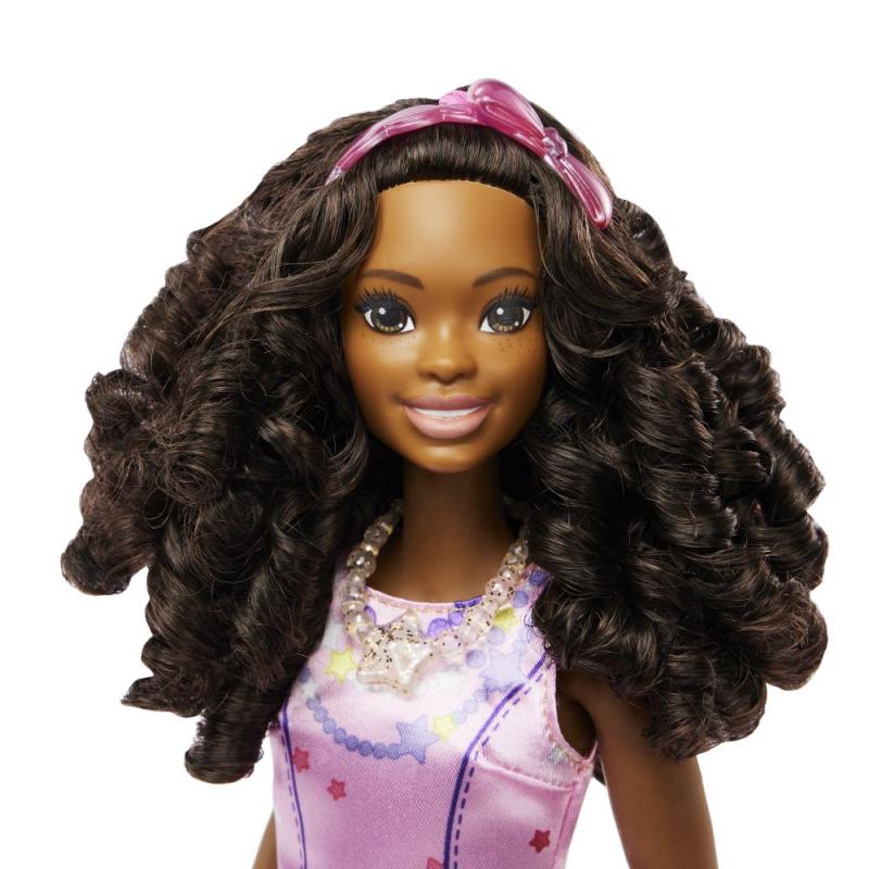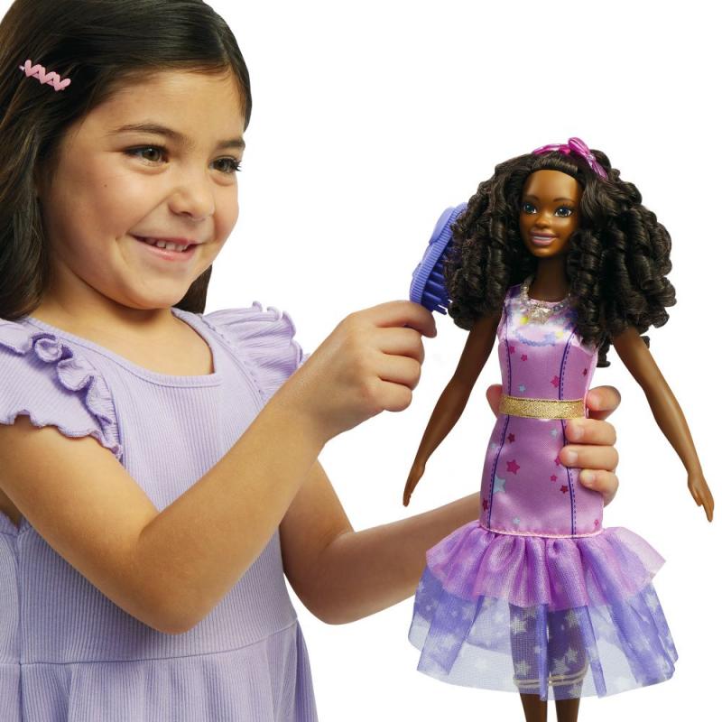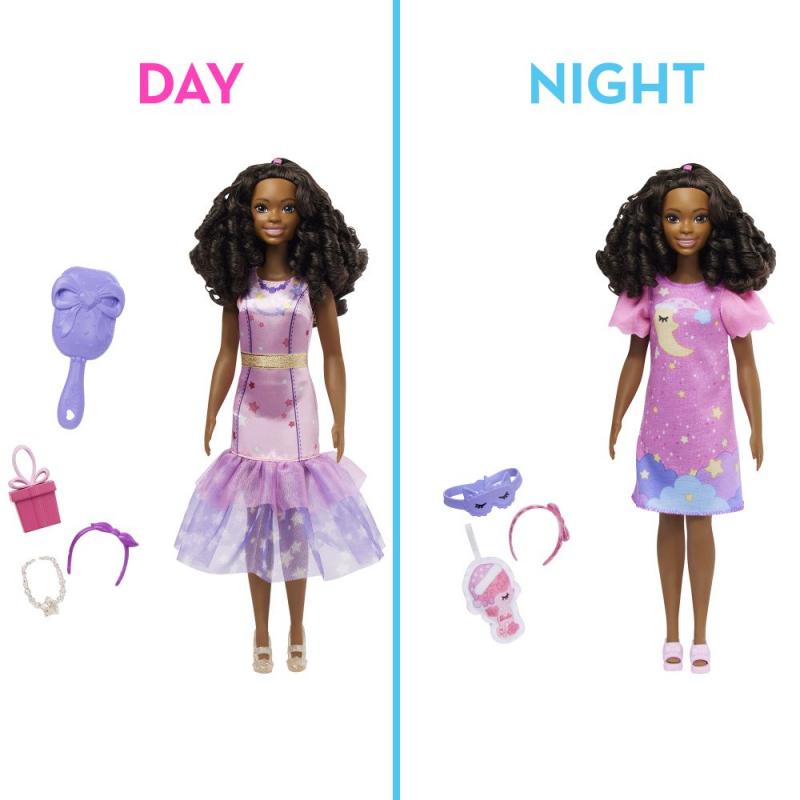 Predstavujeme novú kolekciu hračiek Moja prvá Barbie™, ktorá je špeciálne navrhnutá pre predškolákov! Moja prvá Barbie™ bábika deň a noc (ružová) "Brooklyn" Roberts prichádza s dvoma módnymi outfitmi a množstvom farebných doplnkov a ponúka dve deťmi obľúbené témy hrania: chystanie sa na oslavu a chystanie sa do postele! Táto roztomilá väčšia bábika, ktorá meria 34 cm, má pohyblivé a na dotyk krásne mäkké telíčko, takže sa s ňou drobným ručičkám ľahko manipuluje, prenáša a oblieka! Jej saténové šaty na oslavu sú doplnené čelenkou s mašľou, náhrdelníkom, darčekom a trblietavými topánkami na podpätku. Vďaka jednoduchému zapínaniu na suchý zips je obliekanie hračkou aj pre malé ručičky. Priloženou veľkou kefou môžu deti česať kučeravé čierne vlasy bábiky "Brooklyn", čo pomáha rozvíjať zručnosť a inšpiruje na staranie. Veľké príbehové doplnky, ako sú ospalý plyšový pudel, čelenka, maska na oči s jednorožcom a papučky na podpätku, dopĺňajú bábinou nočnú košieľku a inšpirujú k príjemným a láskyplným chvíľkam pred spaním. Bábika Barbie® nemôže stáť samostatne. Farby a prevedenia sa môžu líšiť.