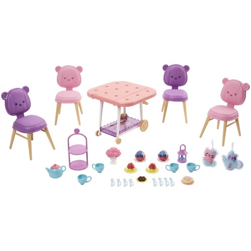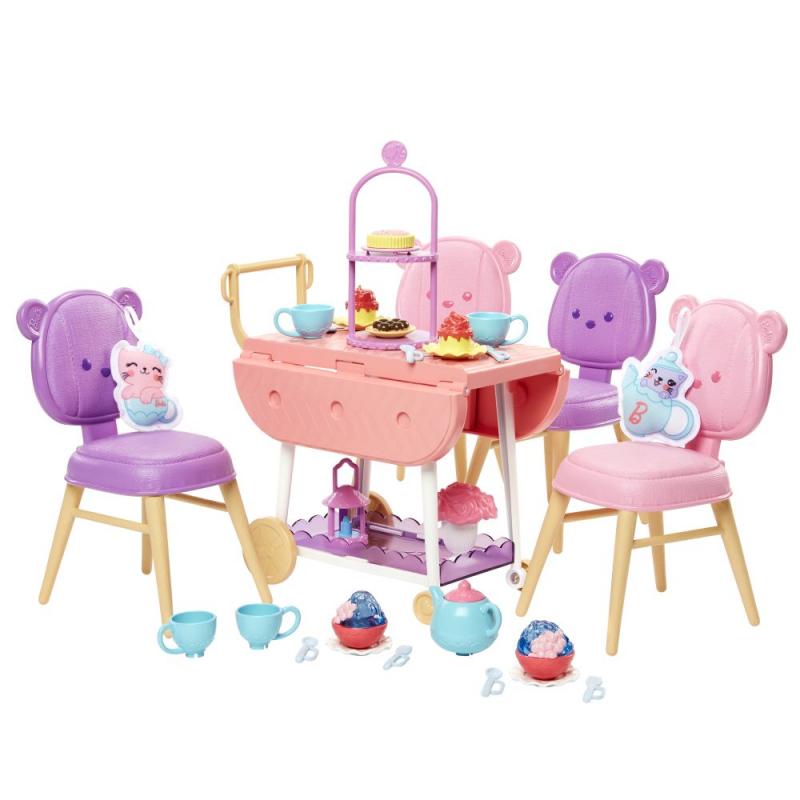 Predstavujeme novú kolekciu hračiek Moja prvá Barbie™, ktorá je špeciálne navrhnutá pre predškolákov! Tento farebný herný set Moja prvá Barbie™ čajová párty obsahuje vozík na pohostenie, ktorý je možné rozložiť na párty stôl. Pripravte sa na príjemné popoludnie so šálkou čaju! Vozík má pojazdné kolieska a obsahuje podnos na uloženie ďalších doplnkov. Na roztomilé stoličky s motívom medvedíka môžu deti usadiť až štyri bábiky Moja prvá Barbie™ (bábiky nie sú súčasťou balenia), ktoré merajú 34 cm. Súčasťou je podnos na pečivo, kytica, svietidlo, kanvička so štyrmi šálkami, štyri páry príborov a šesť úchvatných dezertov a dve plyšové mačiatka! Tieto príbehové doplnky sú vo väčšej veľkosti a ľahko sa s nimi manipuluje! Kolekcia Moja prvá Barbie™ je ideálna pre malé deti a ich drobné ručičky. Bábika Barbie® nie je súčasťou balenia. Farby a prevedenia sa môžu líšiť.