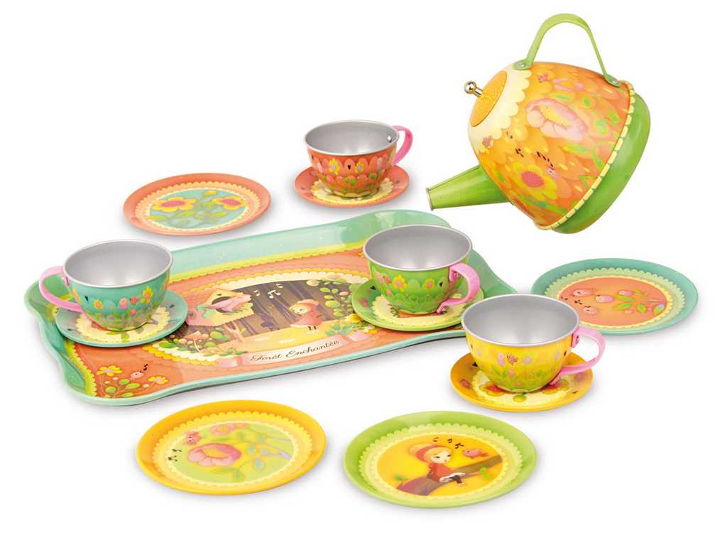 Vilac Čajová sada Musical Kovový set riadu s krásnou rozprávkovou ilustrácií "magického lesu", s podtáčí. Tento set je špeciálny v tom, že pri servírovaní hrá hudbu. V balení nájdete 14 ks vybavenie: veľký tácka pre ľahký presun riadu, 4 hrnčeky s podtácky, 4 dezertné tanieriky a kanvičku, ktorá pri náklone začne hrať peknú melódiu. Veľkosť tak akurát pre detské ruky. Vyrobené vo Francúzsku. Hračky Vilaca majú značku francúzskej agentúry ADEME, to znamená, že tieto drevené hračky sú vyrábané ekologicky. Šetrí životné prostredie, neznečisťujú pôdu, vodu a vzduch, neplytvajú energiami. Už viac ako 100 rokov plní značka Vilac detské sny. Spoločnosť Vilac sídli hlboko v srdci pohoria Jura, obklopená horami, jazerami a lesmi. Táto francúzska spoločnosť vyrába od roku 1911 drevené hračky v klasickom, starodávnom štýle s modernými farbami a vzormi. Hračky Vilac sú jedinečné, nikdy nevyjdú z módy a dokážu očariť všetky generácie. Vilac pomáha utvárať detskú predstavivosť svojimi radostnými ilustráciami či dizajny a reinterpretácijou klasických hračiek, ktoré sa len tak neopotrebujú. Deti dostávajú na Vianoce a narodeniny spústy hračiek, väčšina z nich je však nezaujme na dlhú dobu, láska k hračke sa nenaplní. Drevené hračky Vilac vzbudzujú vášeň aj o 50 rokov neskôr, keď ako dospelí náhodou nájdete v podkroví hračky, ktoré ste ako deti milovali. Vilac už 100 rokov prepája deti s hračkami, ktoré si obľúbia a váži si ich. A prečo je deti tak milujú? To zostáva tajomstvom firmy Vilac.