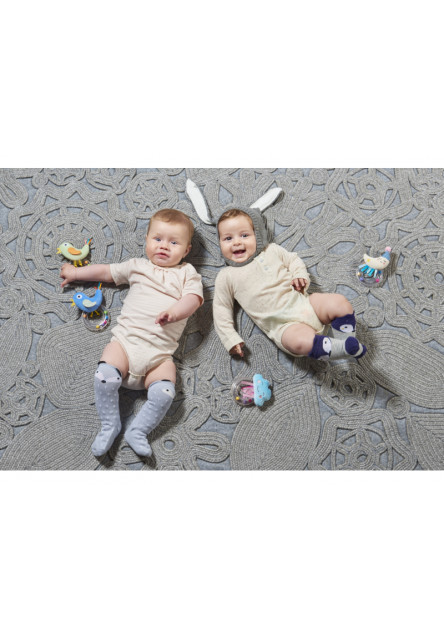 Chrastítko tvoří měkká plyšová hračka ve tvaru ptáčka a průhledný plastový kroužek naplněný barevnými korálky. Různé tvary a povrchy hračky podněcují dítě ke zkoumání rukama i ústy a pomáhají rozvíjet jemnou motoriku a smysly dítěte. Vhodné pro děti od narození.