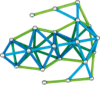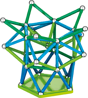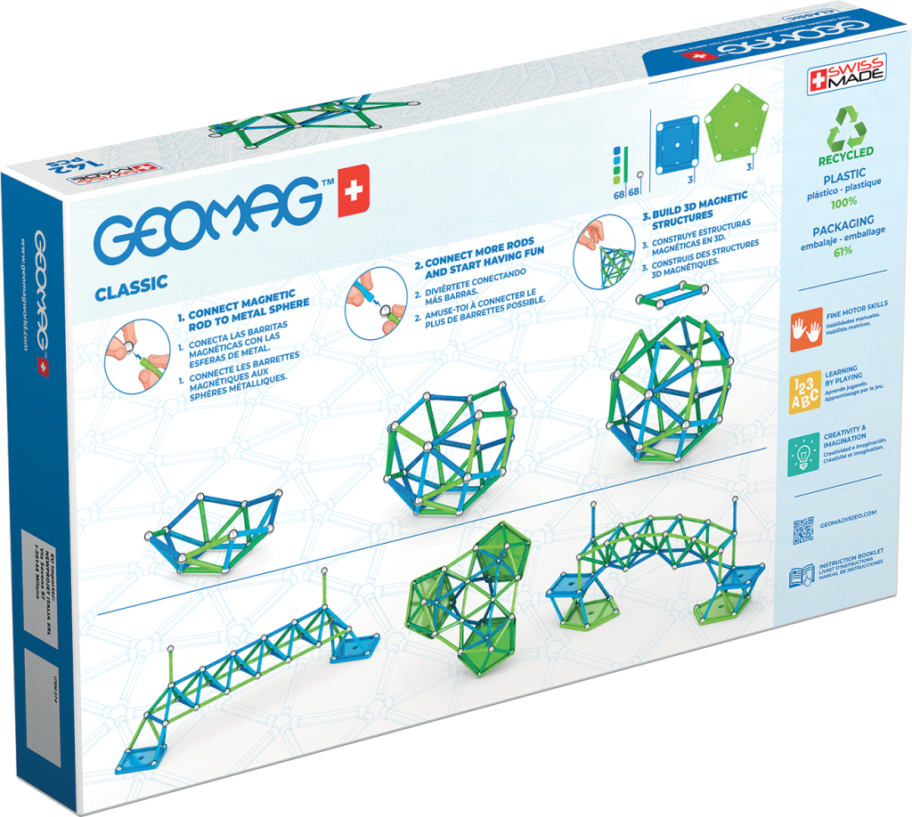 Magnetická stavebnice GEOMAG Classic ze 100% recyklovatelného materiálu. Stavebnice obsahuje 68 magnetických tyček v kombinaci světle modré, tmavě modré, zelené a limetkové barvy, 68 ocelových kuliček, 3 modré čtvercové a 3 limetkové pětiúhelníkové plastové podstavce. Celkem 142 dílků. Stavebnice je určena pro děti od 3 let. Vyrobeno ve Švýcarsku.