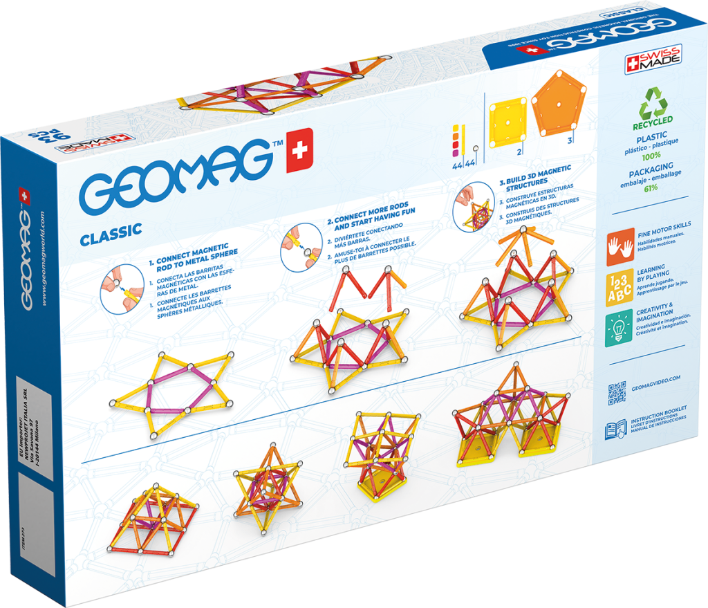 Magnetická stavebnice Geomag Classic obsahuje celkem 93 dílků, které umožňují stavbu různých prostorových konstrukcí. Sada zahrnuje 44 magnetických tyček v pestrých barvách – žluté, oranžové, červené a fialové, které jsou vyrobeny ze 100% recyklovaného plastu. Tyto tyčky jsou doplněny o 44 ocelových kuliček, jež slouží jako spojovací prvky, a o plastové podstavce – dva žluté čtvercové a tři oranžové pětiúhelníkové. Díky těmto prvkům je možné vytvářet různé geometrické tvary a struktury, které jsou ukázány i na obalu a v příkladech sestavených modelů.